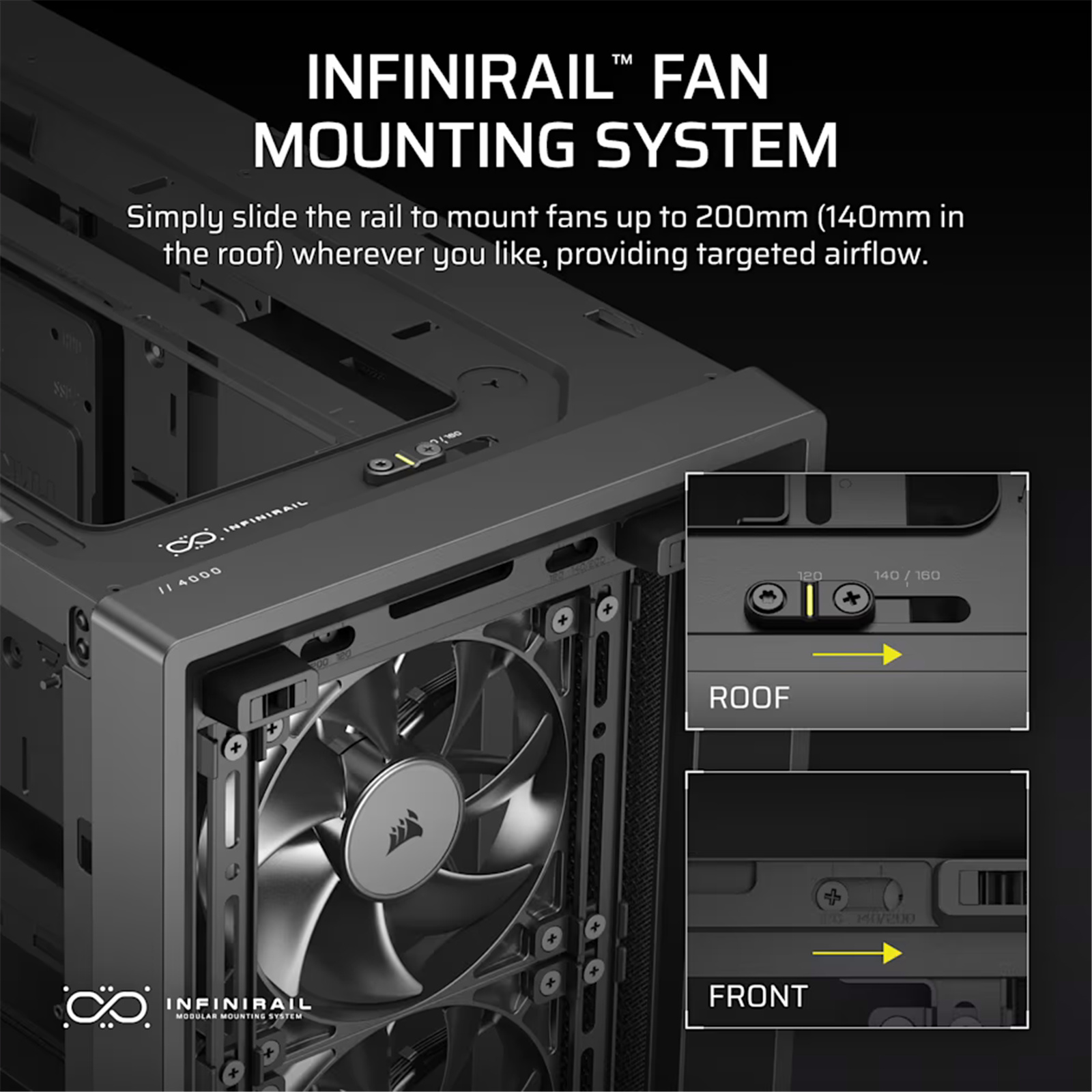 The CORSAIR FRAME 4000D RS is a fully-modular and spacious mid-tower PC case featuring InfiniRail™ Fan Mounting System and compatible with reverse connector motherboards.