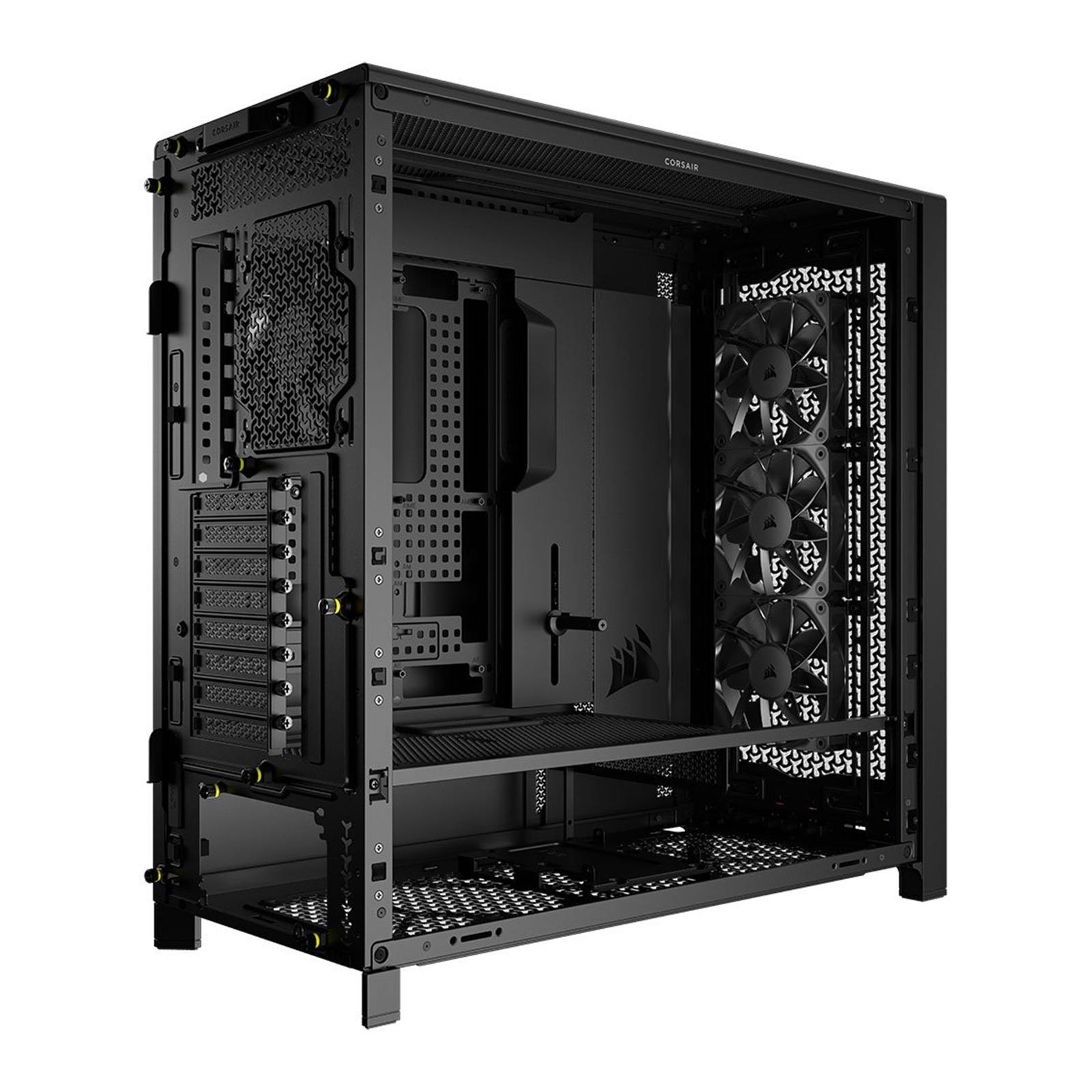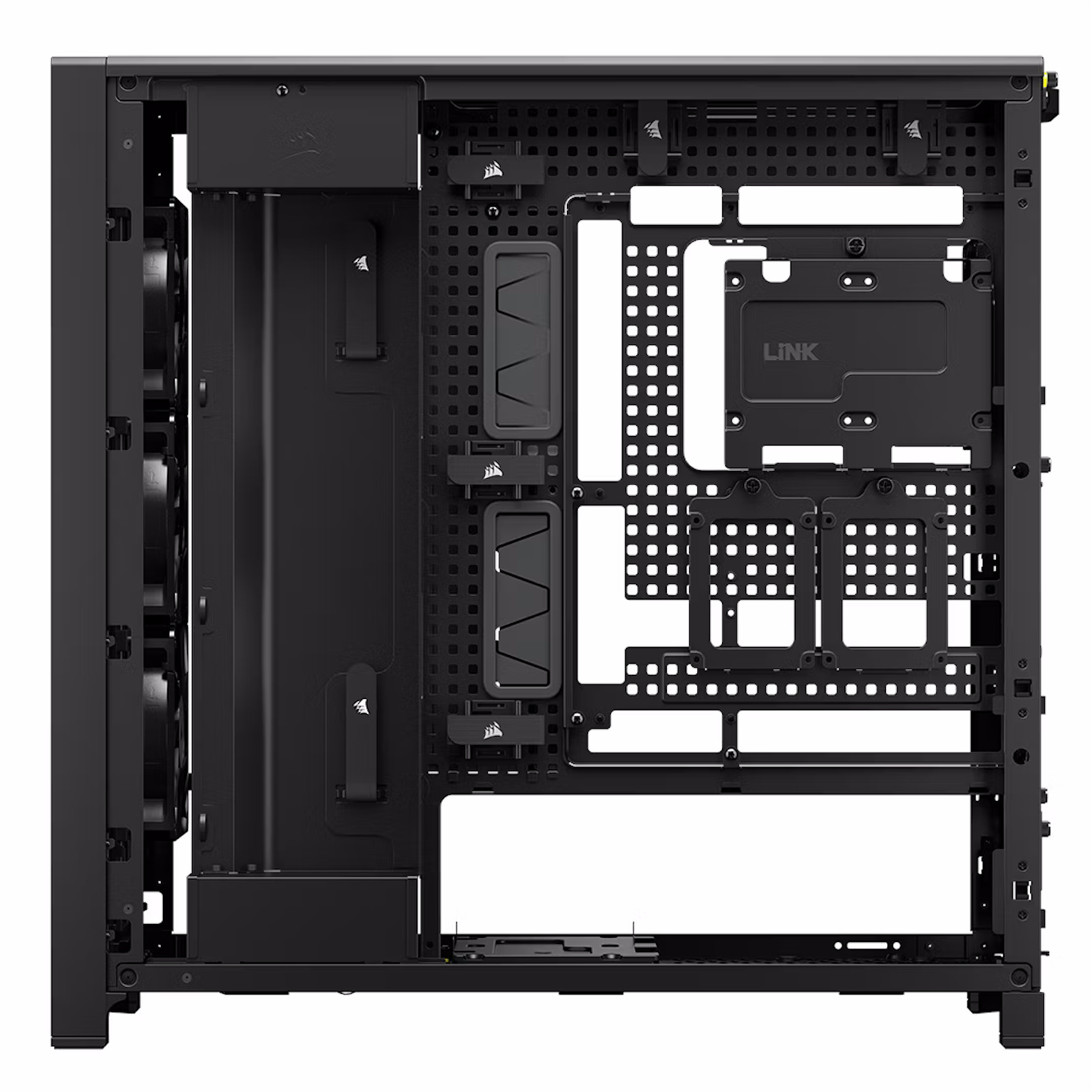 The CORSAIR FRAME 5000D RS is a modular and spacious mid-tower PC case featuring InfiniRail™ Fan Mounting System, RapidRoute 2.0 cable management, and is compatible with reverse connector motherboards.