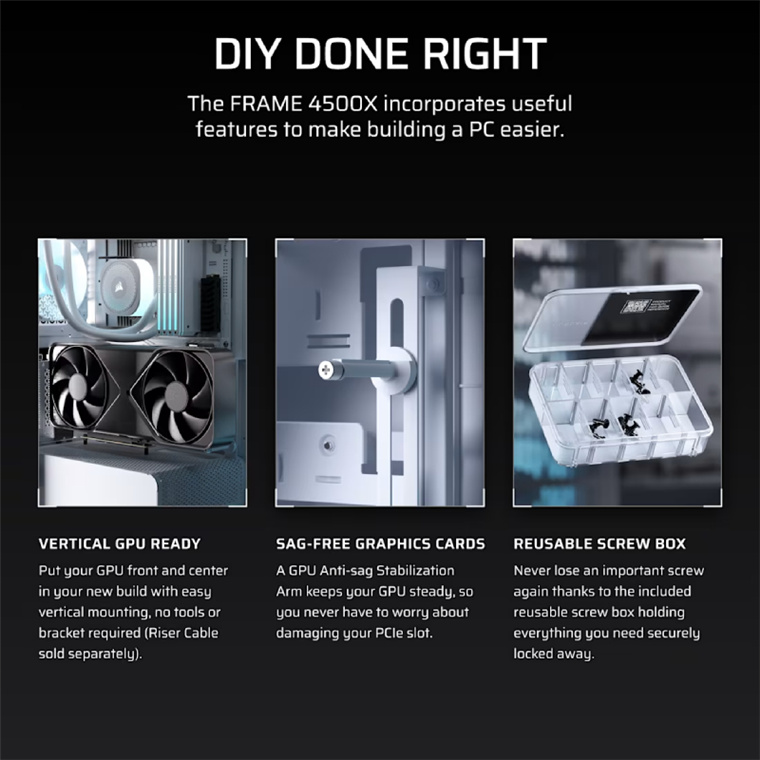 The FRAME 4500X incorporates useful features to make building a PC easier.