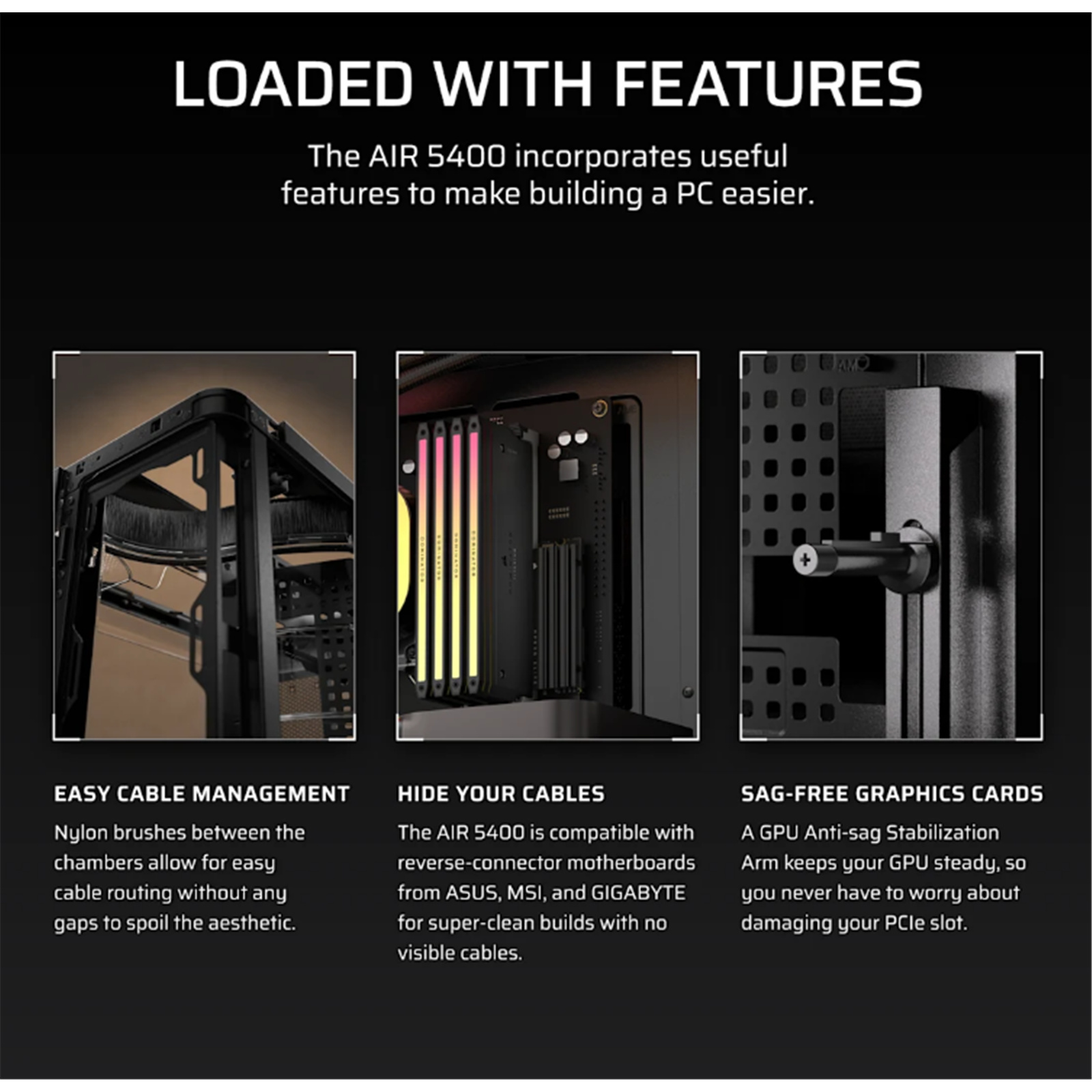 The AIR 5400 is compatible with reverse-connector motherboards from ASUS, MSI, and GIGABYTE for super-clean builds with no visible cables.