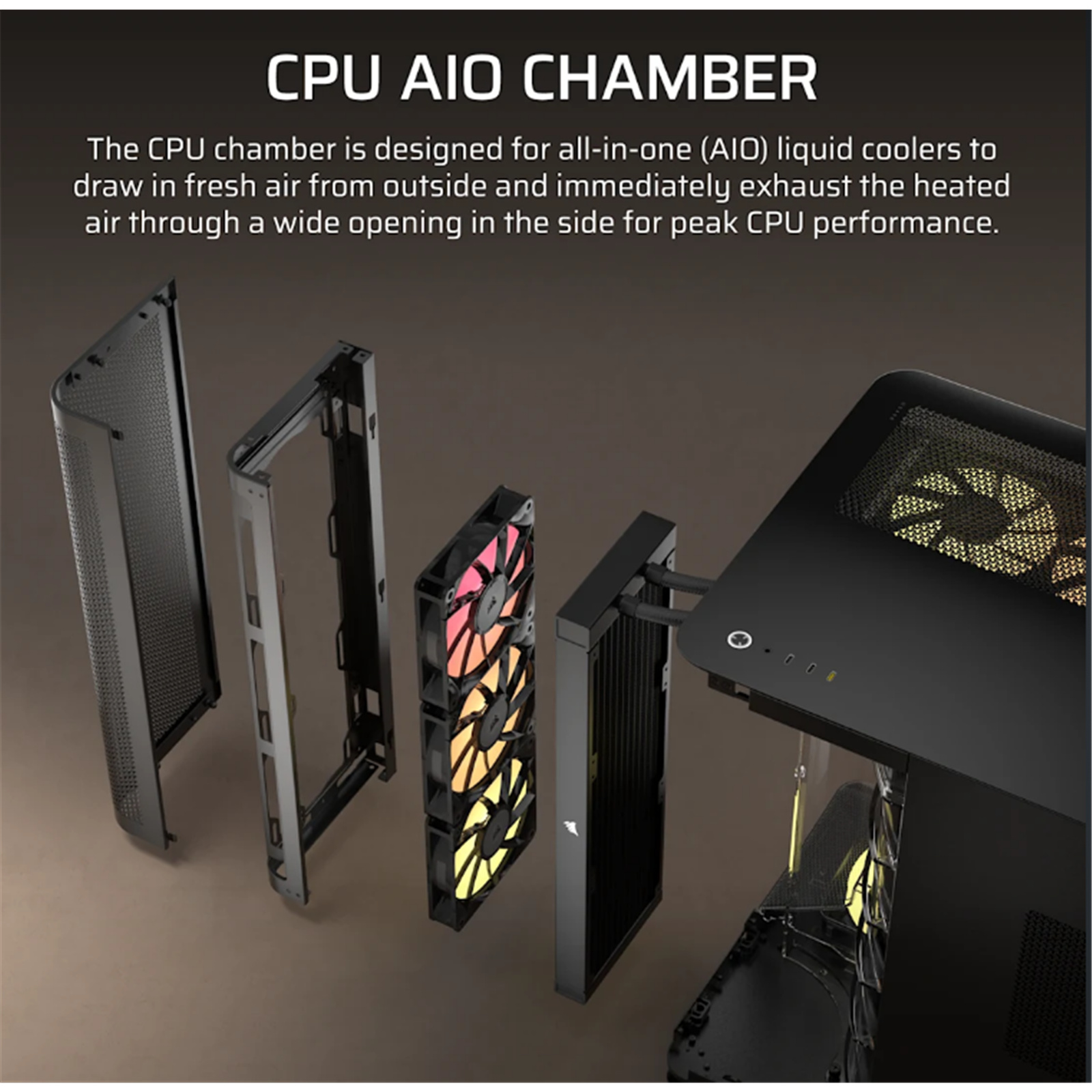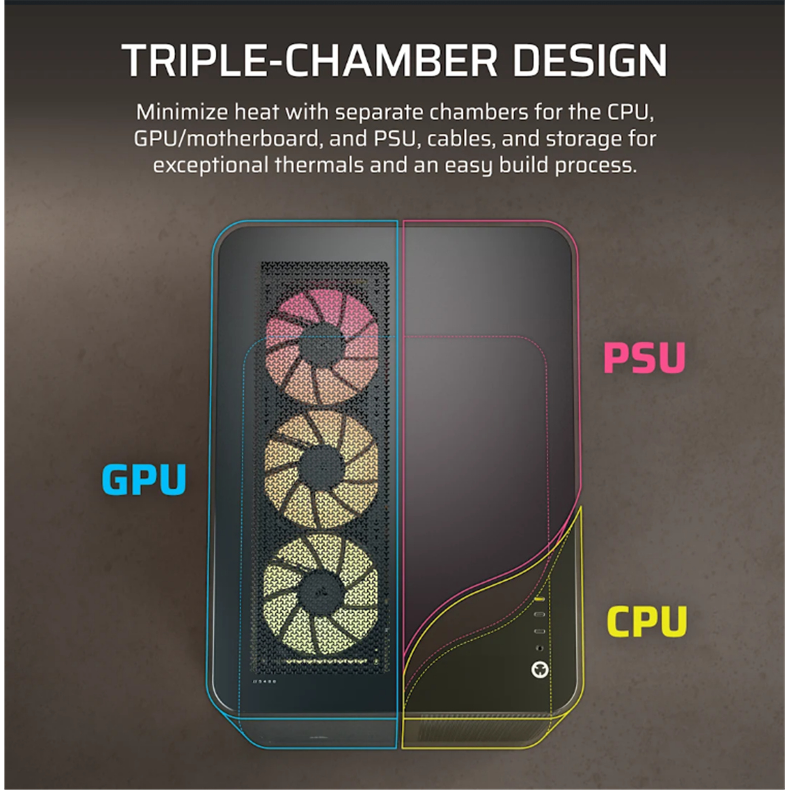 A unique triple-chamber design was created to isolate hot components for effective cooling and maximum performance at all times. Separate chambers for the CPU, GPU/motherboard, and PSU, cables, and storage allow for exceptional thermals and an easy PC building process.