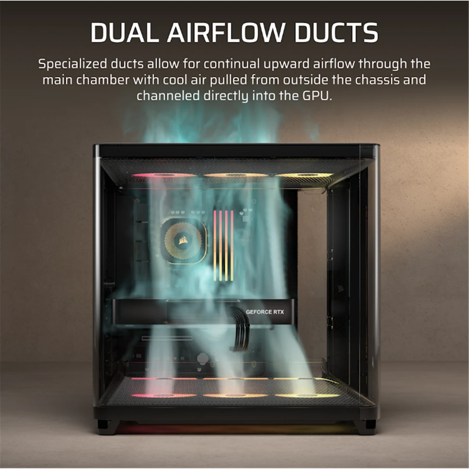 The roomy interior was designed specifically for the most powerful GPUs with plenty of room to breathe and dual airflow ducts to channel cool air through the GPU for maximum performance.