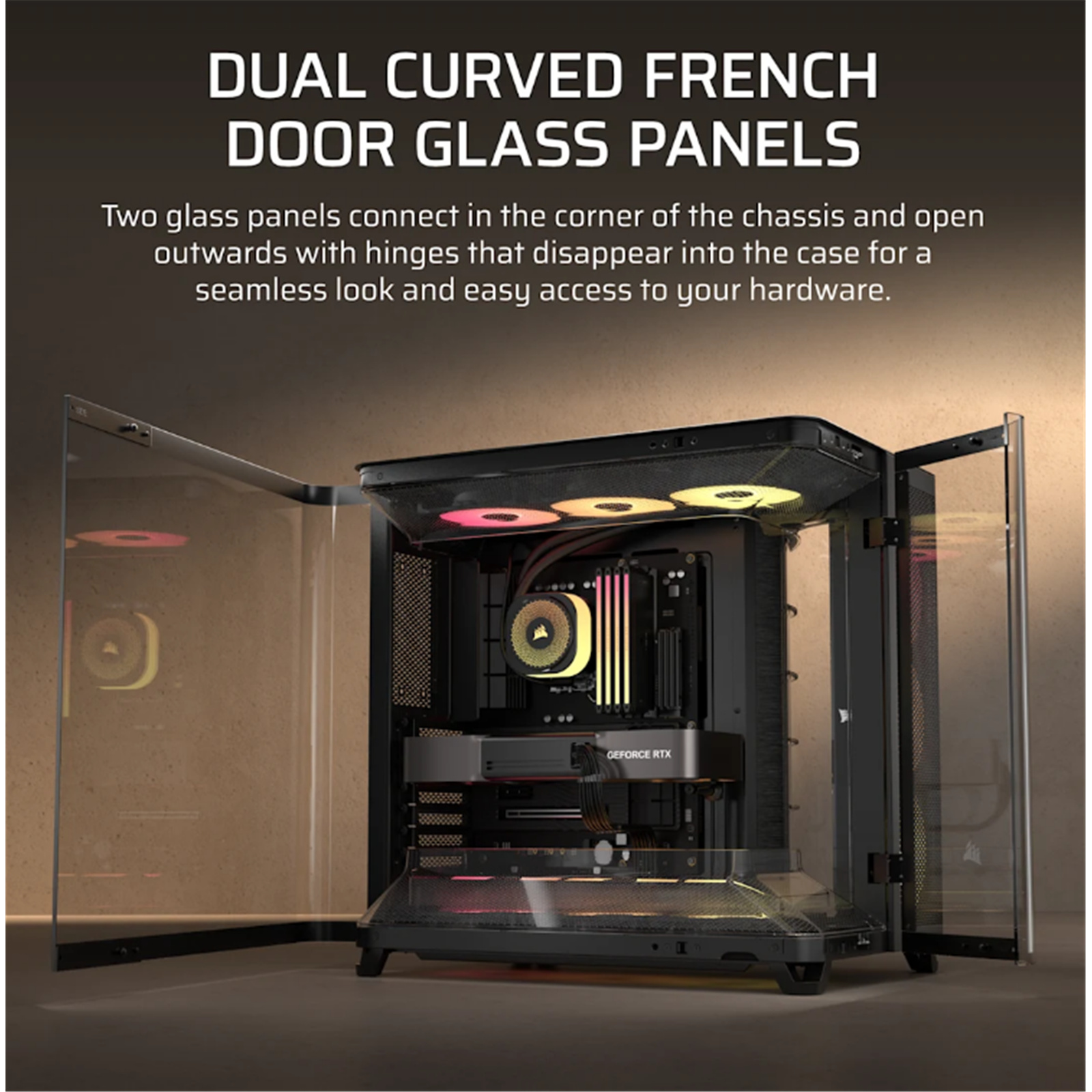 Two glass panels connect in the corner of the chassis and open outwards with hinges that disappear for a seamless look and easy access to your hardware.
