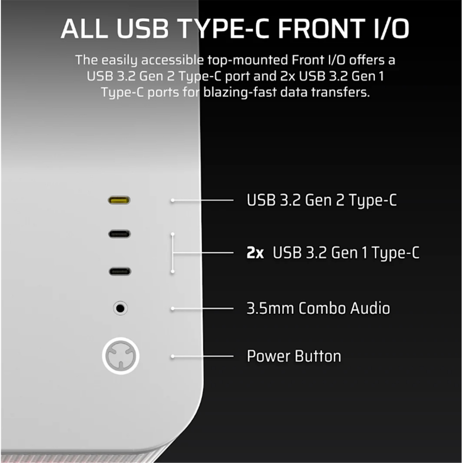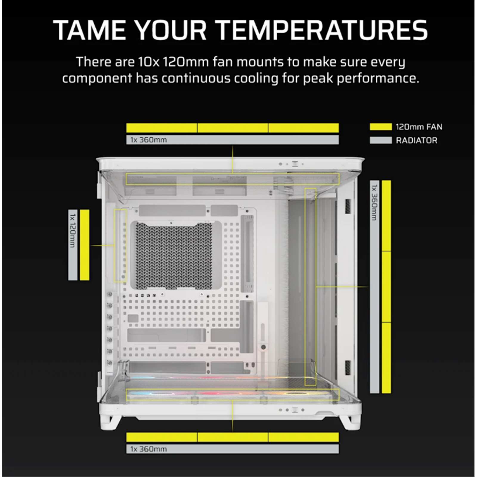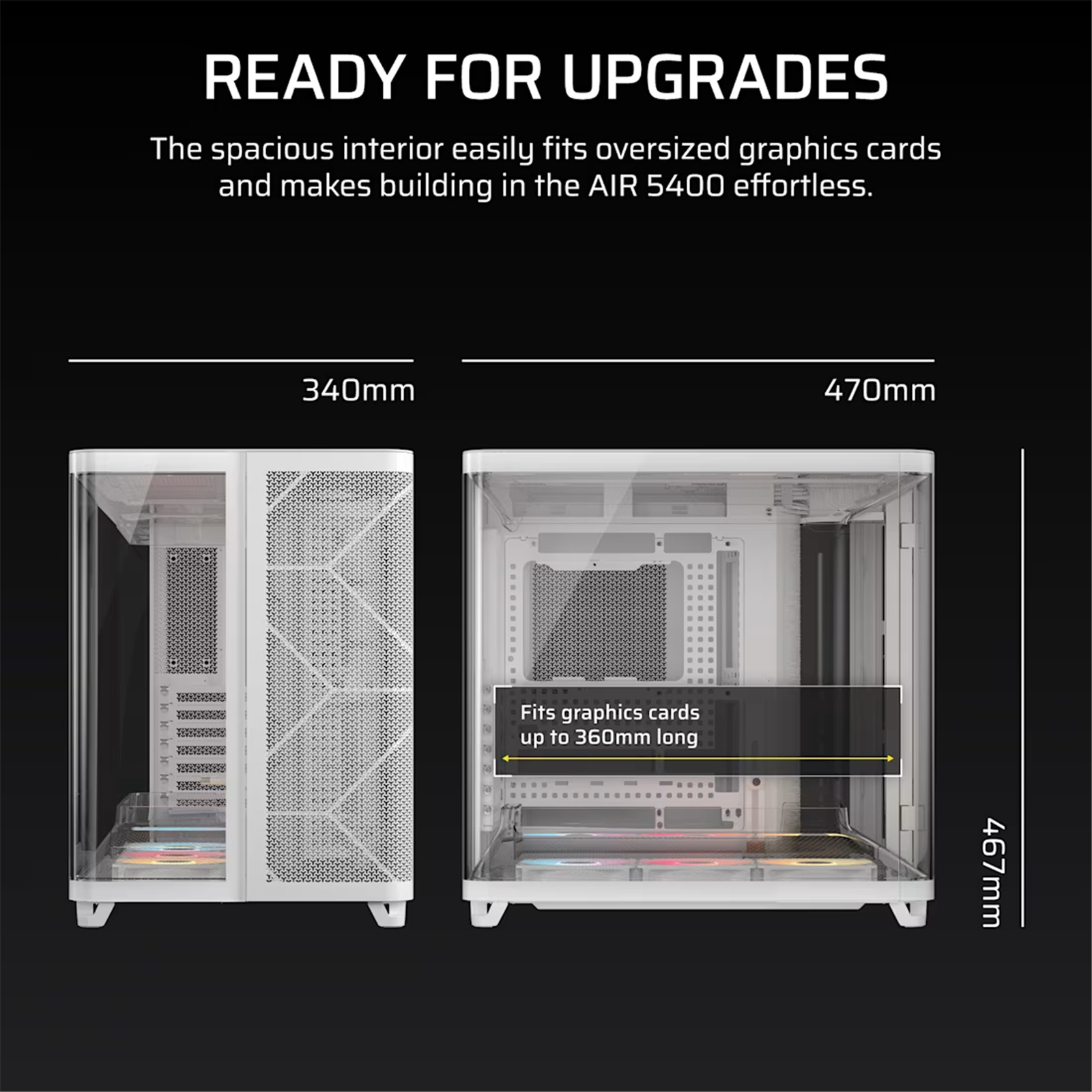 Corsair Air 5400 RS-R ARGB White ATX Gaming Case Tempered Glass 3x 120mm ARGB Fan Pre-installed, CPU Cooler Support Upto 180mm, GPU Support Upto 360mm, 7x PCI, 360mm Radiator Supported, Front I/O: 3x Type C, HD Audio