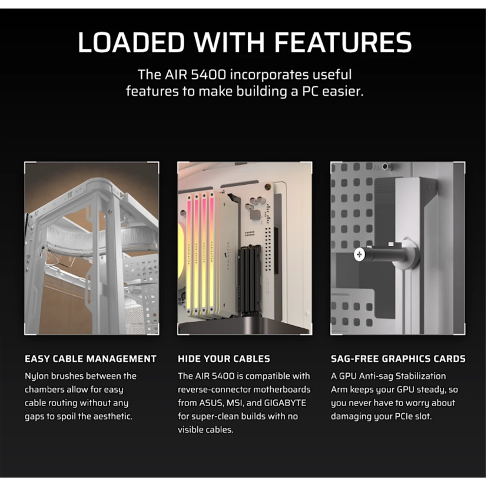 The AIR 5400 is compatible with reverse-connector motherboards from ASUS, MSI, and GIGABYTE for super-clean builds with no visible cables.