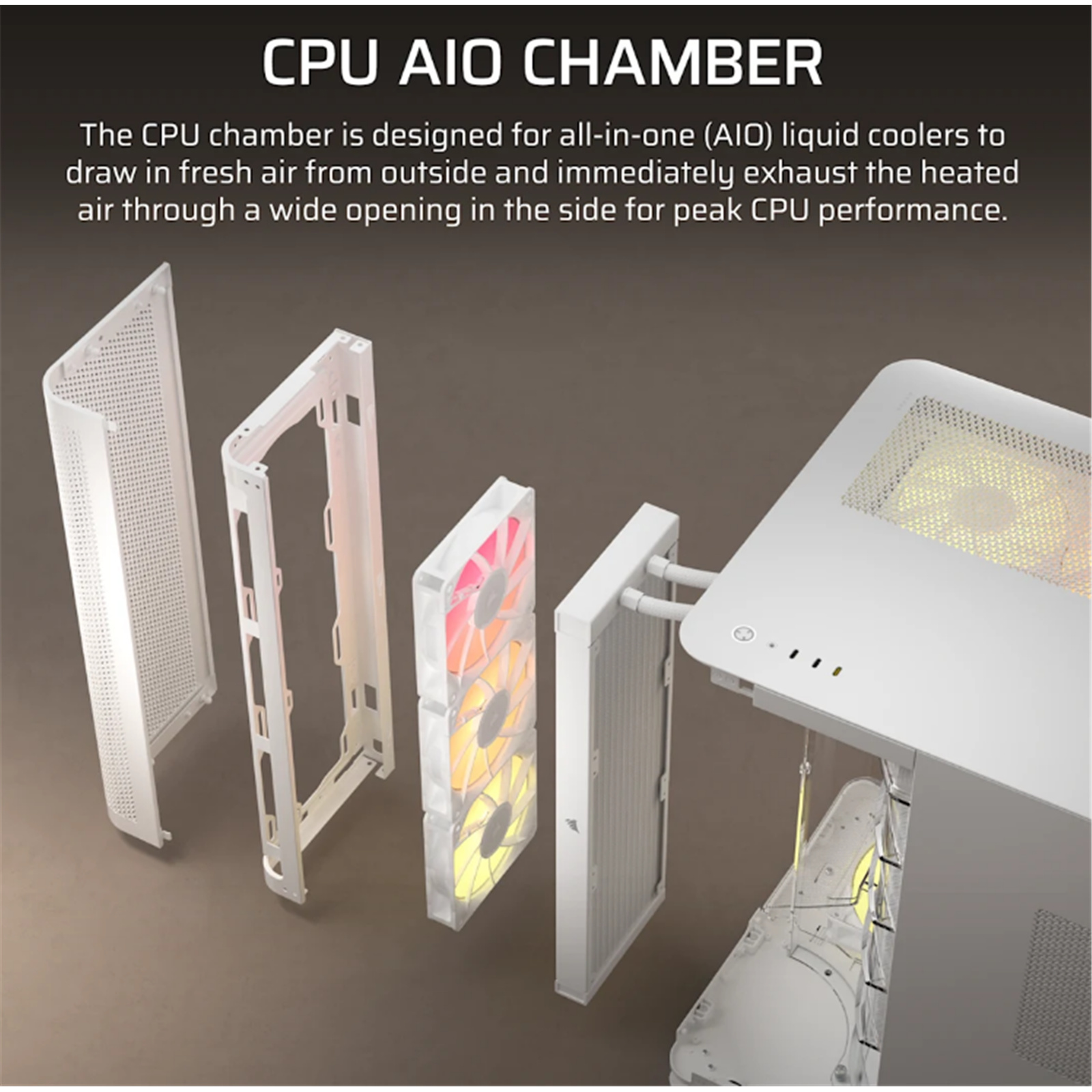 A unique triple-chamber design was created to isolate hot components for effective cooling and maximum performance at all times. Separate chambers for the CPU, GPU/motherboard, and PSU, cables, and storage allow for exceptional thermals and an easy PC building process.