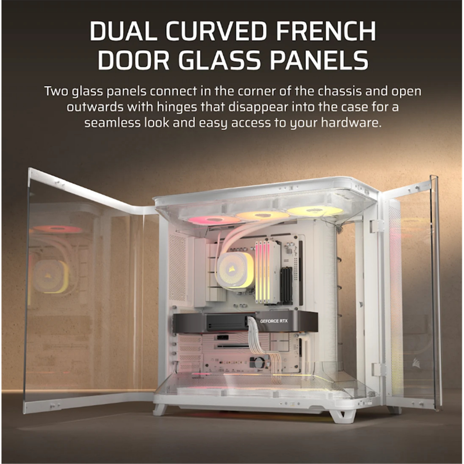 Two glass panels connect in the corner of the chassis and open outwards with hinges that disappear for a seamless look and easy access to your hardware.