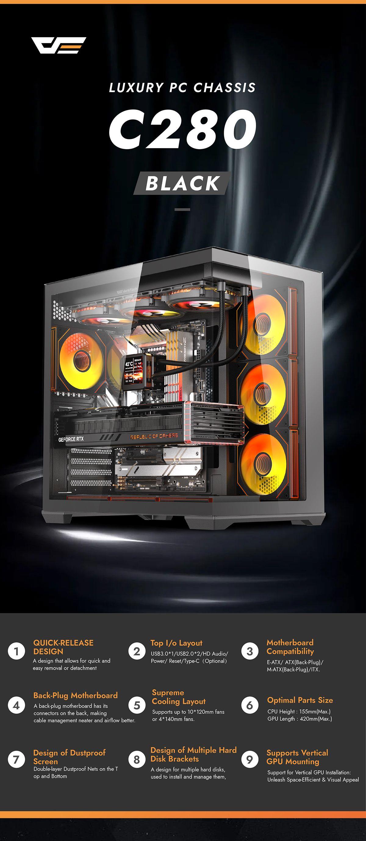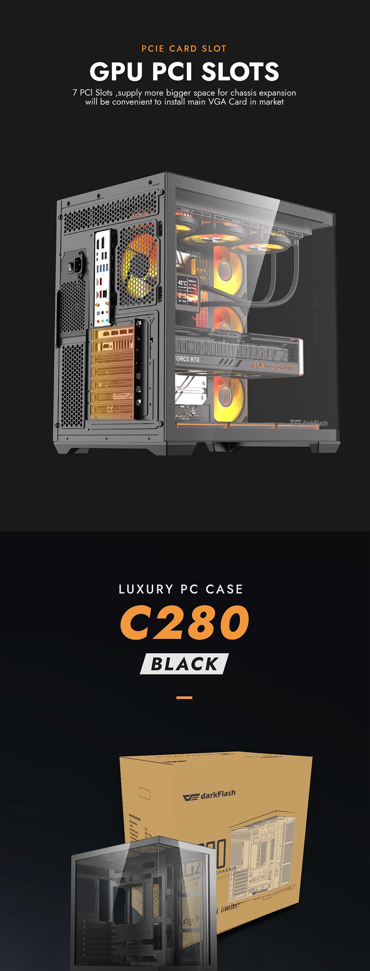 DARKFLASH C280 Dual Chamber Tempered Glass E-ATX Mid Tower Case - Black 7x ARGB Fans - CPU Cooler Support up to 155mm - GPU Support up to 420mm - 7x PCI Slots - 360mm Radiator Support - Front I/O: 3x USB - HD Audio