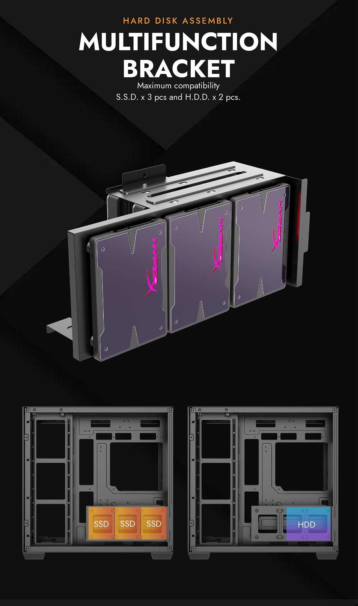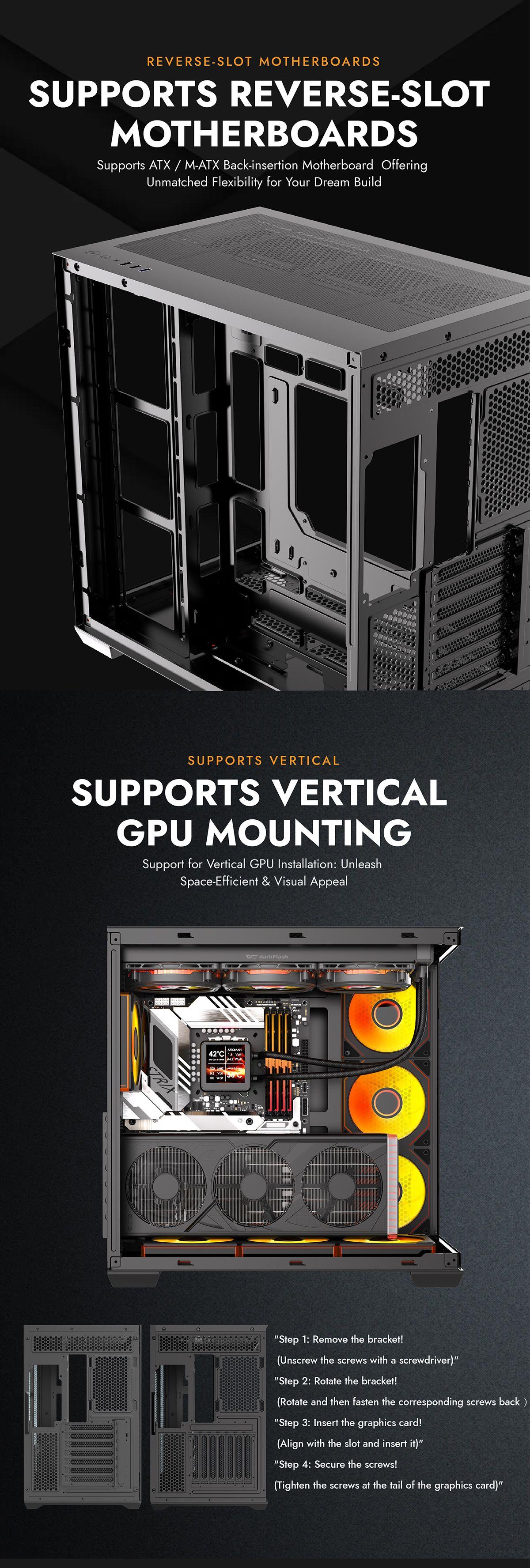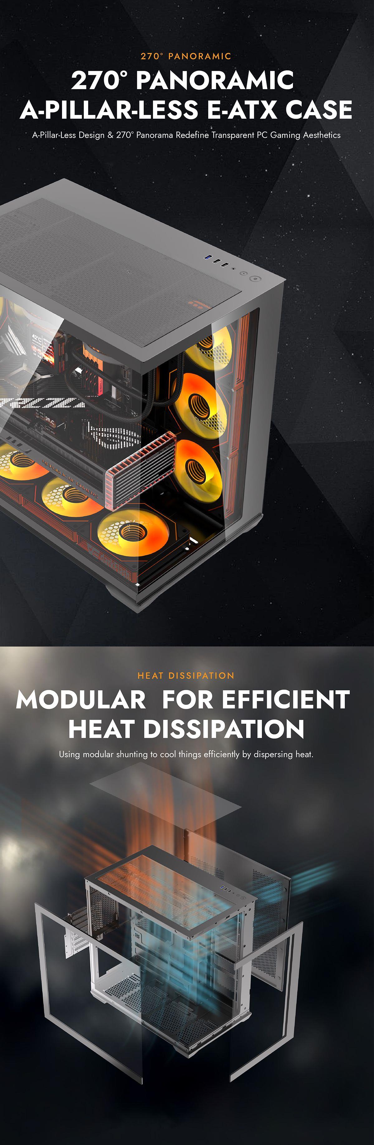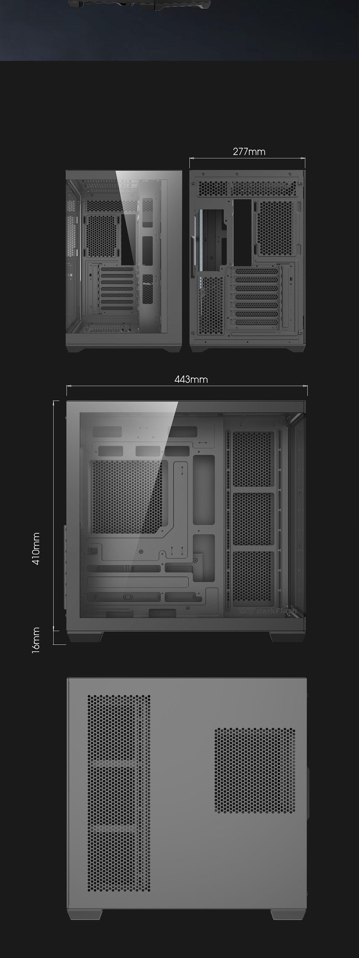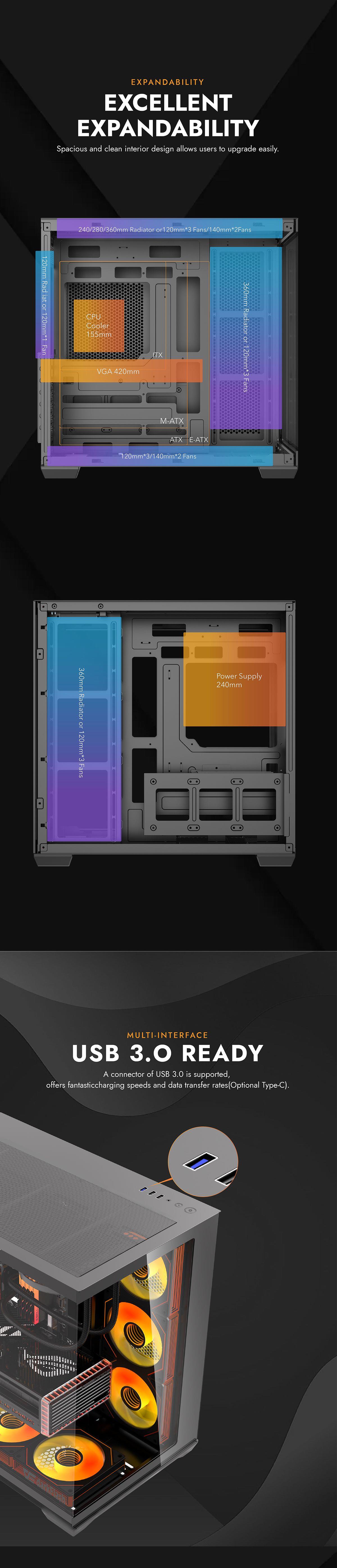 7x ARGB Fans - CPU Cooler Support up to 155mm - GPU Support up to 420mm - 7x PCI Slots - 360mm Radiator Support - Front I/O: 3x USB - HD Audio