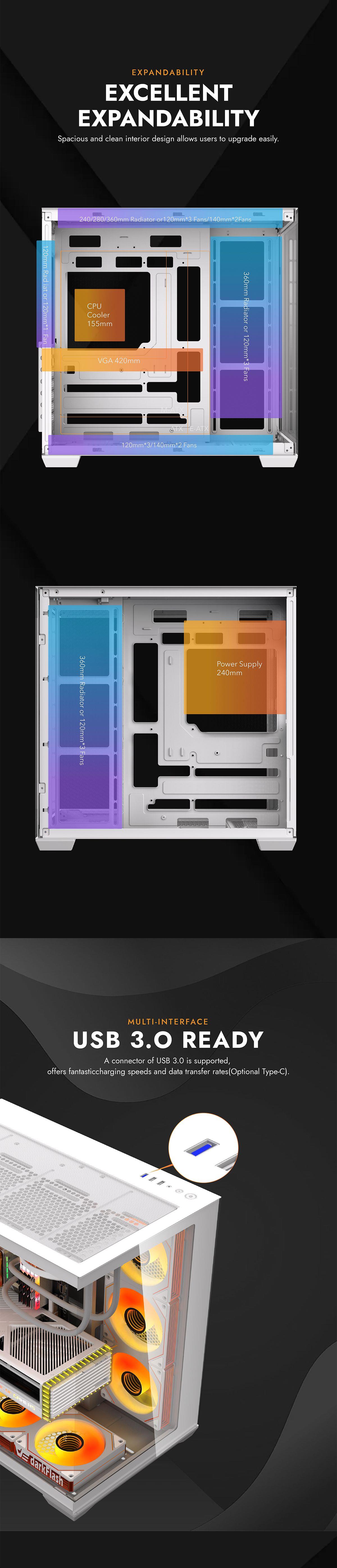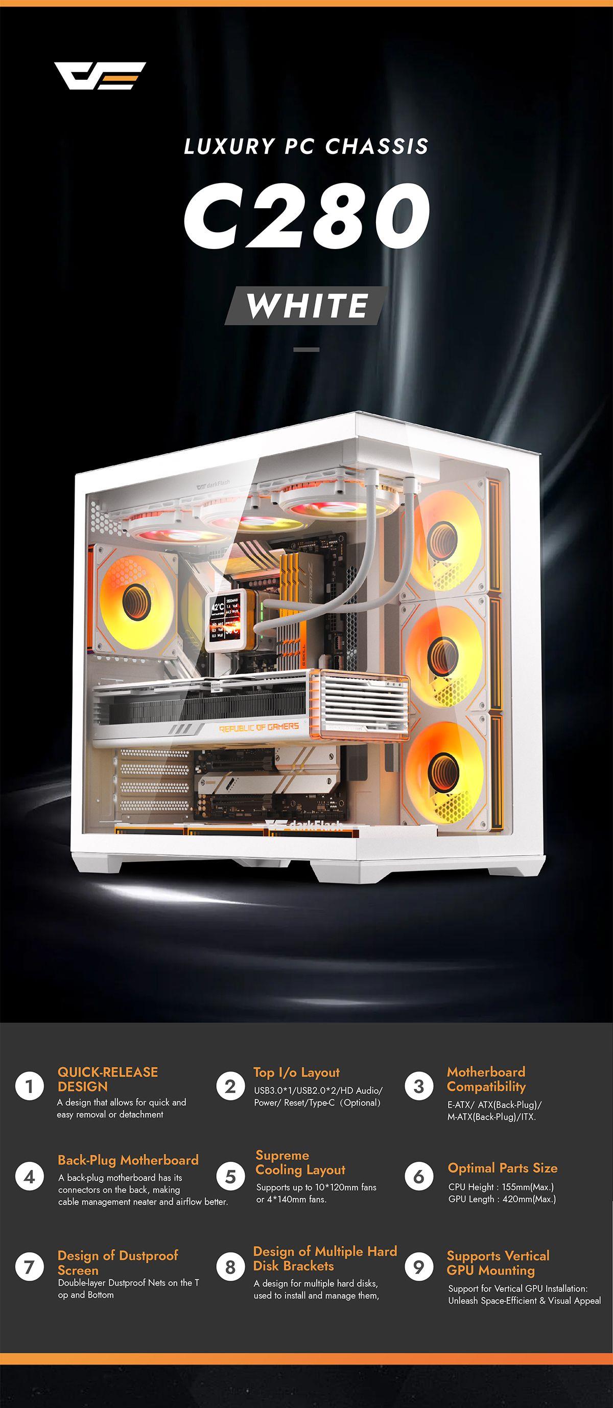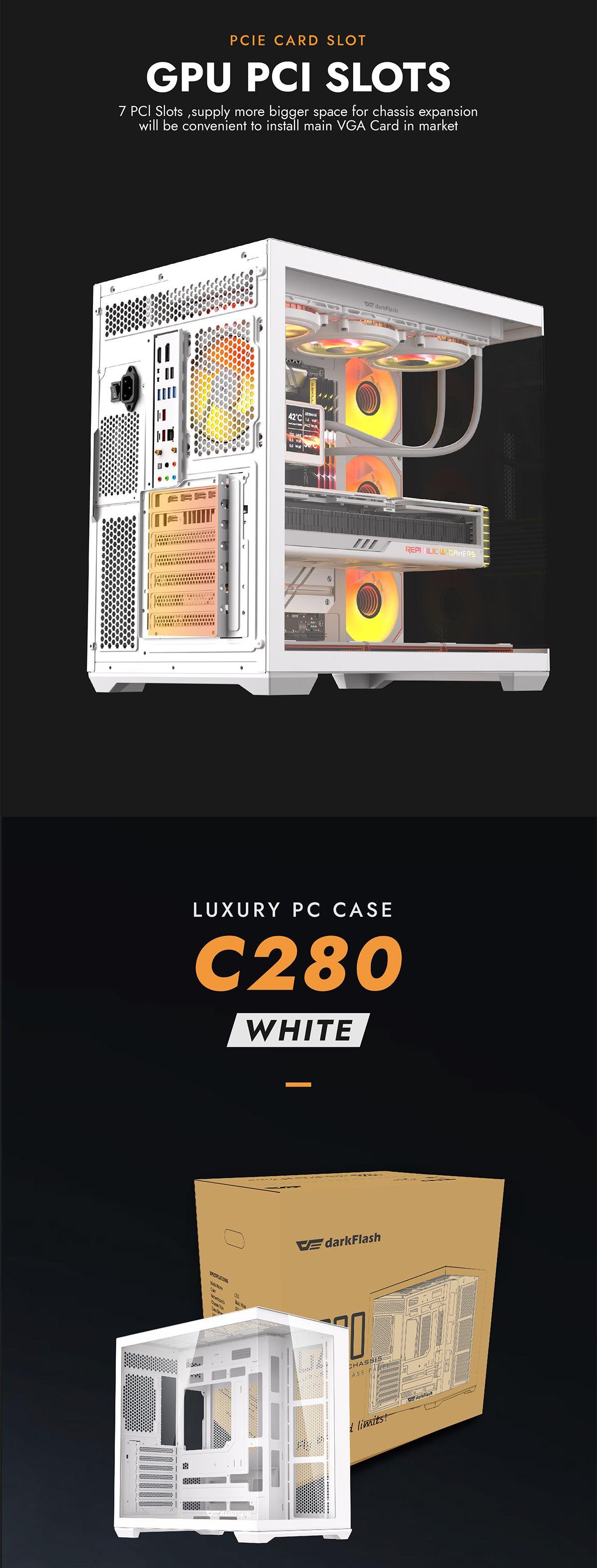 DARKFLASH C280 Dual Chamber Tempered Glass EATX Mid Tower Case - White 7x ARGB Fans - CPU Cooler Support up to 155mm - GPU Support up to 420mm - 7x PCI Slots - 360mm Radiator Support - Front I/O: 3x USB - HD Audio