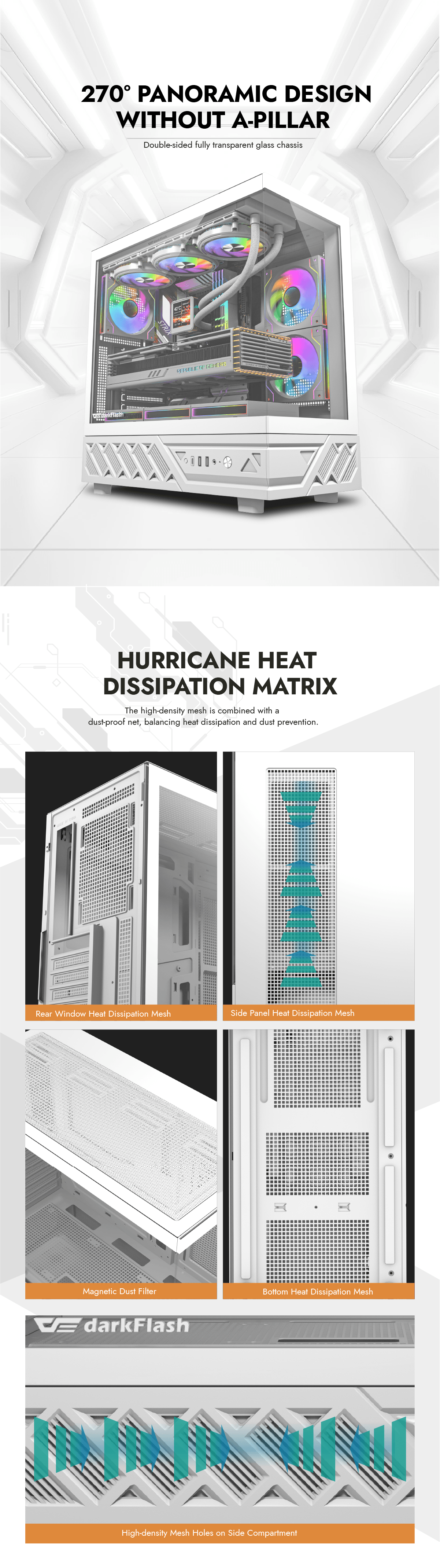 DARKFLASH DS950 ATX Tempered Glass Mid Tower Case - White 6 x ARGB Fans - CPU Cooler Support up to 180mm - GPU Support up to 400mm - 7x PCI Slots - 360mm Radiator Support - Front I/O: 2x USB - 1x USB-C - HD Audio