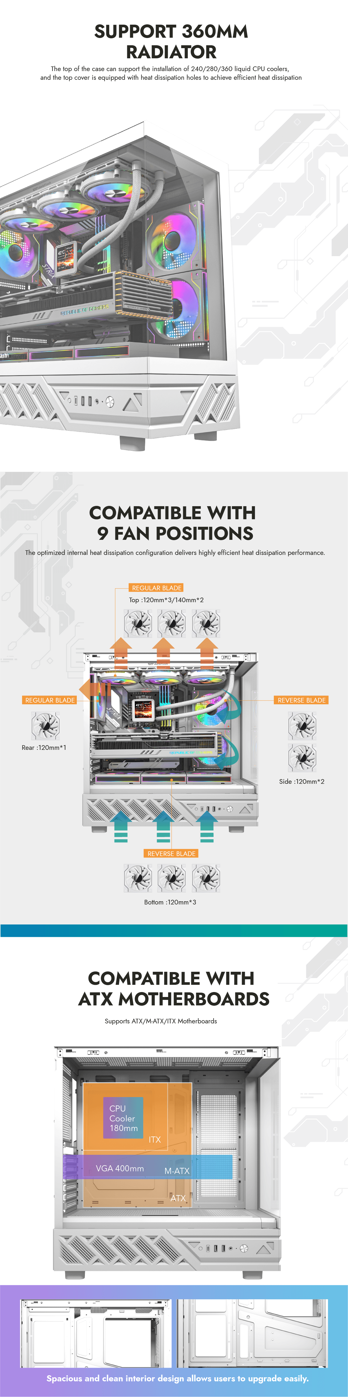 6 x ARGB Fans - CPU Cooler Support up to 180mm - GPU Support up to 400mm - 7x PCI Slots - 360mm Radiator Support - Front I/O: 2x USB - 1x USB-C - HD Audio