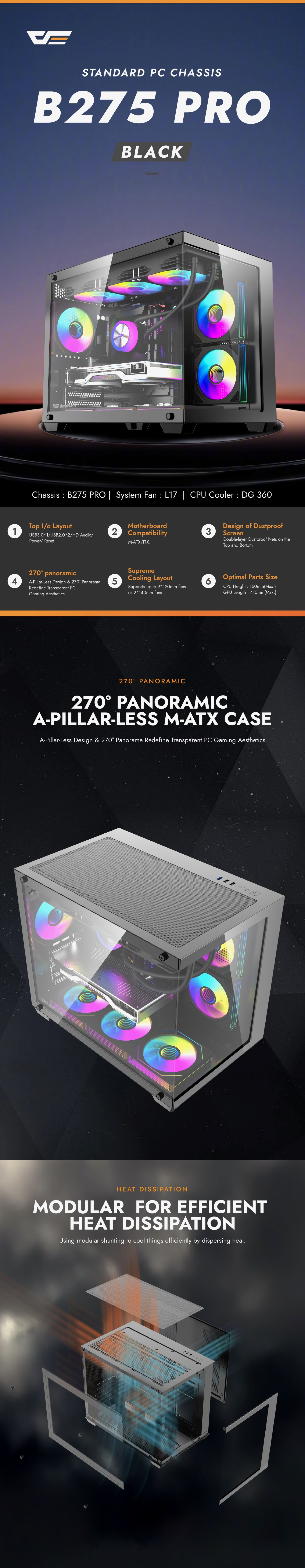 DARKFLASH B275 Pro Tempered Glass mATX Mini Tower Case with 6 X ARGB Fans - Black Dual Chamber - CPU Cooler Support up to 160mm - GPU Support up to 410mm - 5x PCI Slots - 360mm Radiator Support - Front I/O: 3x USB - HD Audio