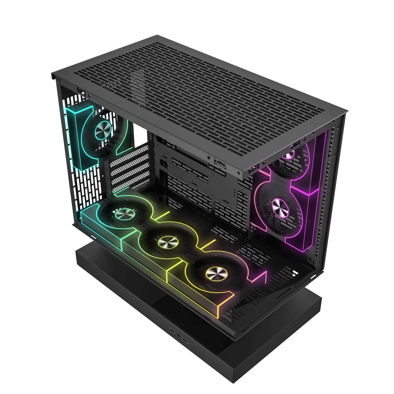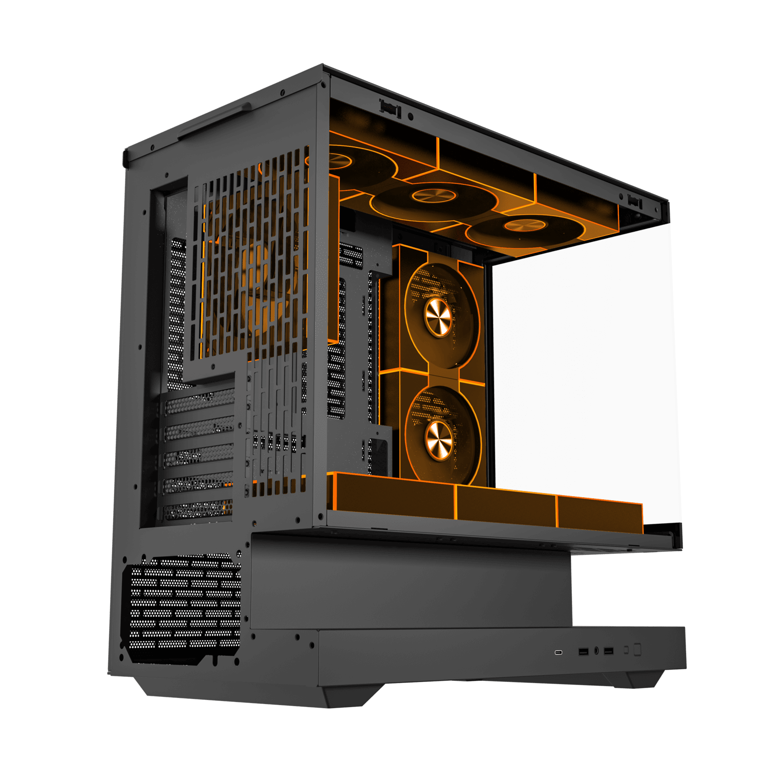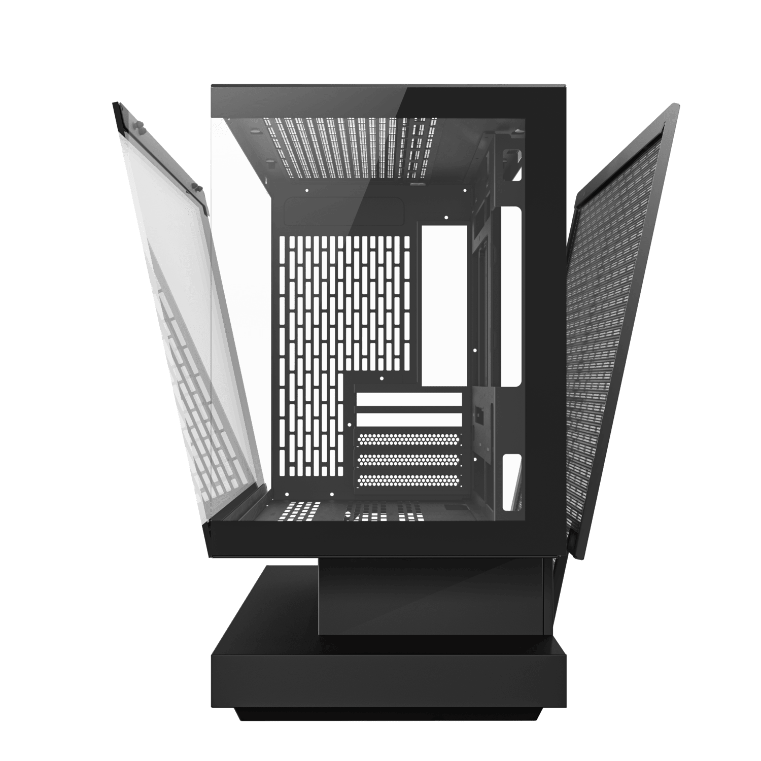 Floating above its foundation, the base channels air from bottom and sides into a seamless multidirectional flow. Cooler, steadier, and built for performance, it turns airflow into a defining part of the design