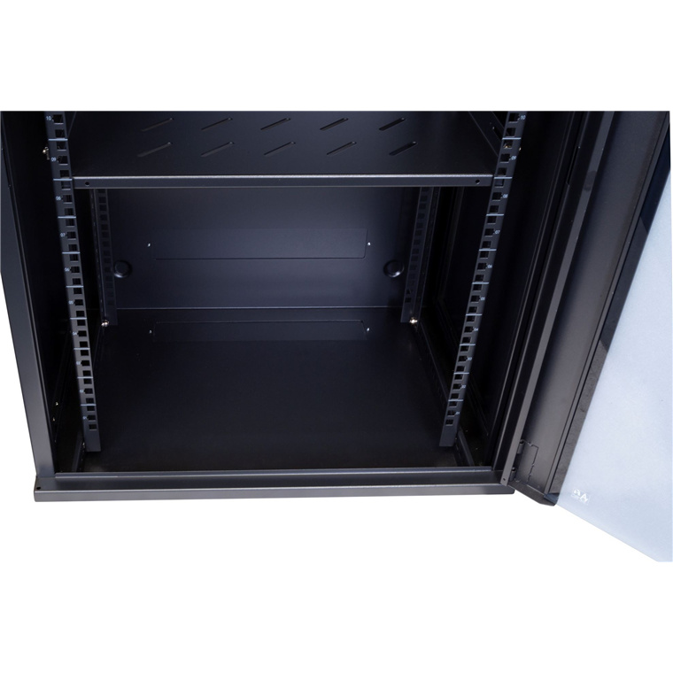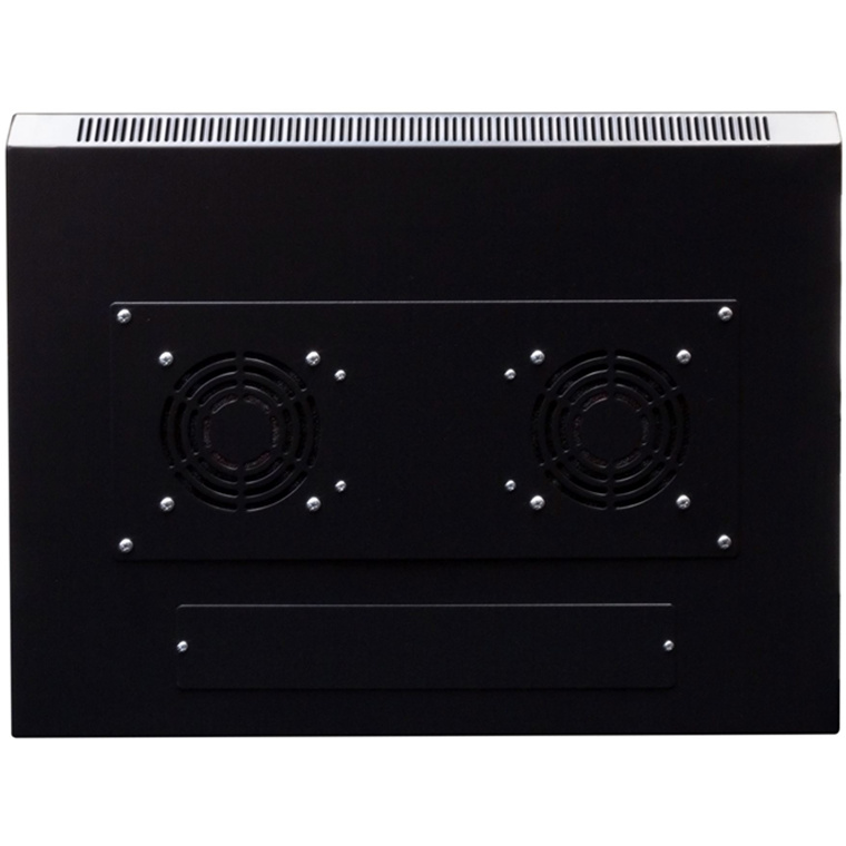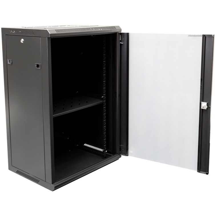 18RU Wall Mount Cabinet 450mm Deep (600x450x910mm). Includes 1x Fixed Shelf, 2x Fans and 10x Cage Nuts. Black Gloss Colour, Tinted Glass front door.