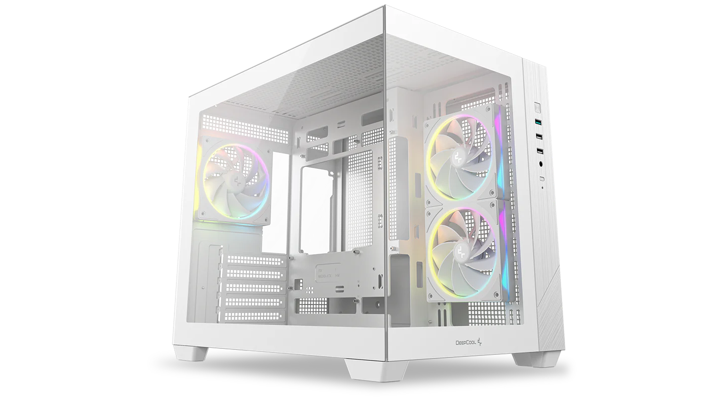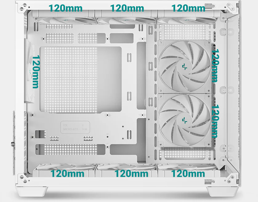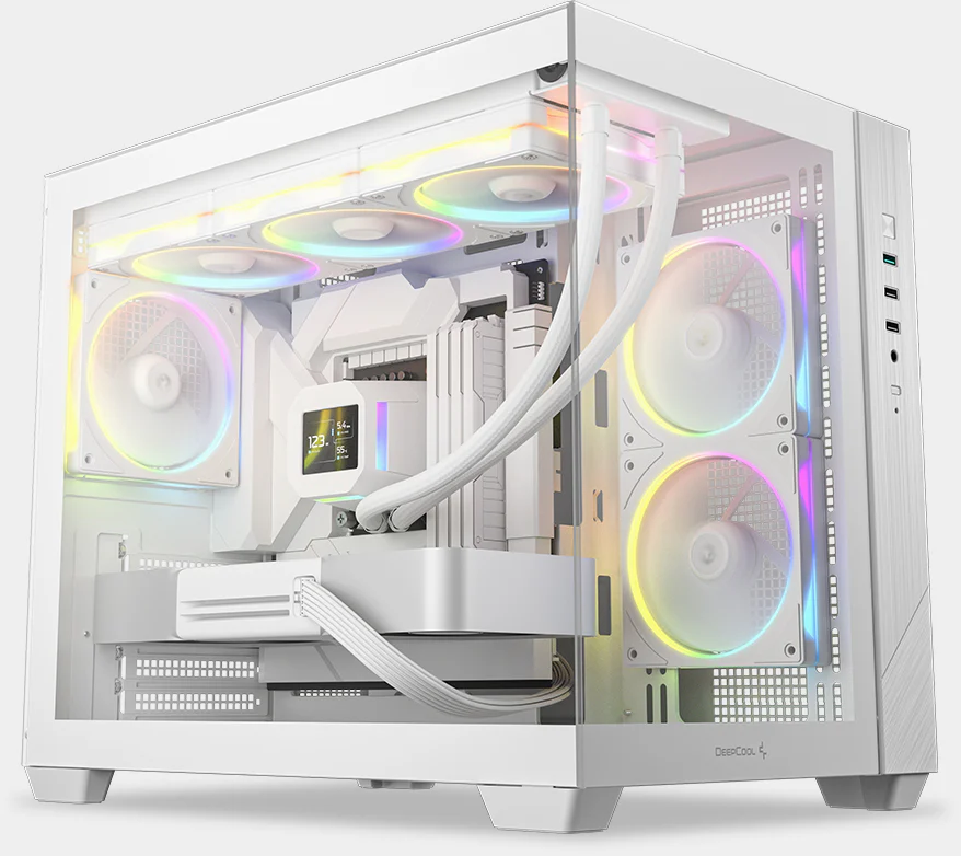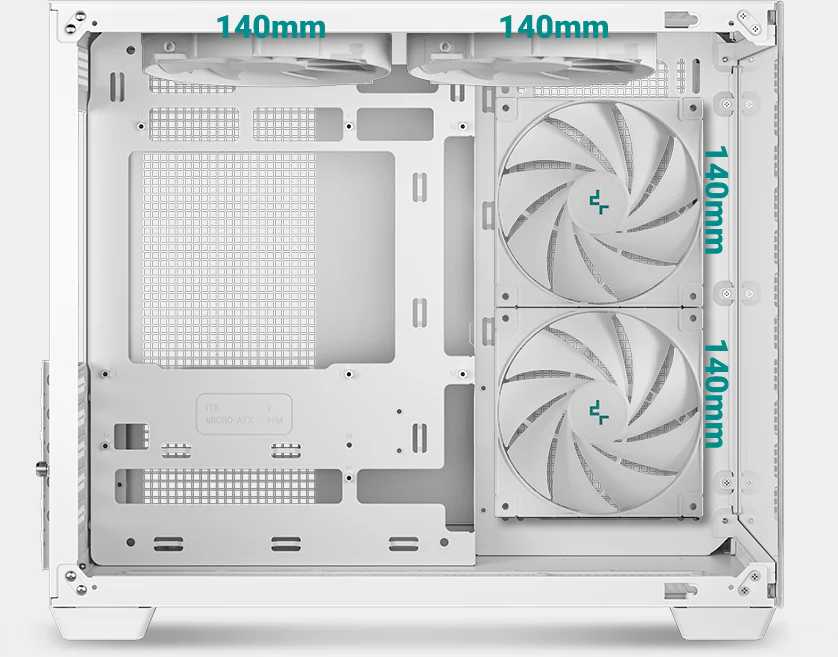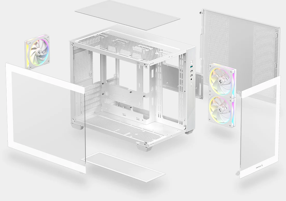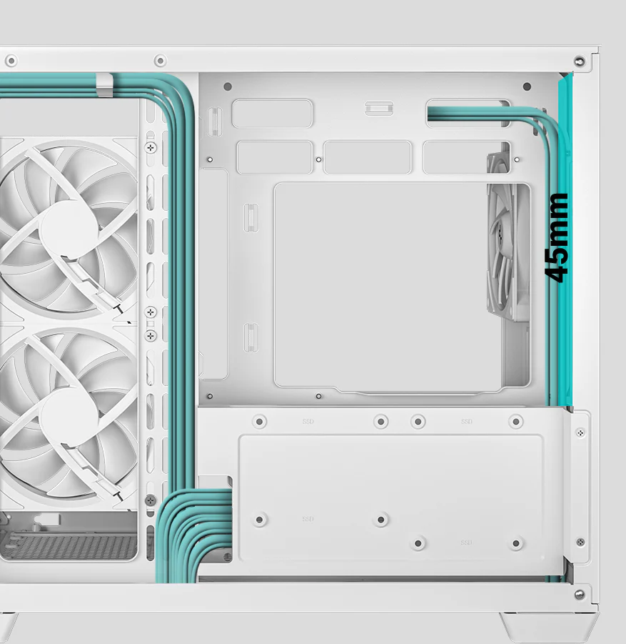 The CG330 3F WH comes pre-installed with two reverse-blade FL series fans on the side and one standard at the rear, forming a horizontal airflow channel that cools effectively. DeepCool's unique lighting design delivers a uniform glow to your build.