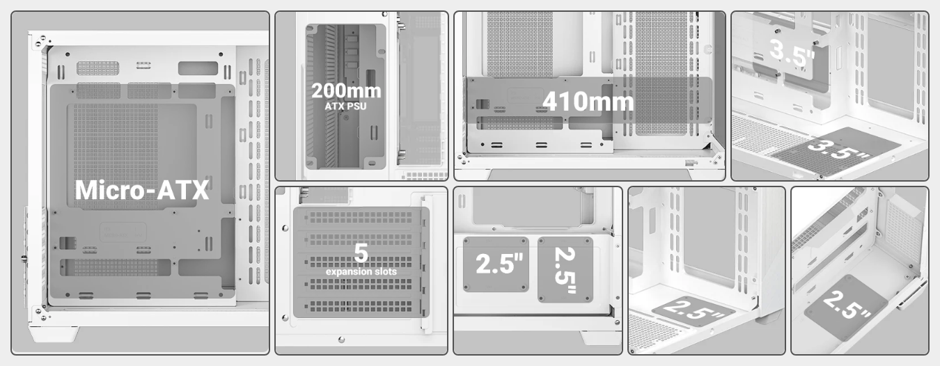 Compact in size yet generous in compatibility, the CG330 3F WH supports GPUs up to 410mm, ATX PSUs up to 200mm, and CPU coolers up to 164mm. With 5 PCIe slots, it accommodates most modern graphics and expansion cards, while storage options include up to 2× 3.5"" HDDs and 4× 2.5"" SSDs, giving you flexibility to balance capacity and speed.