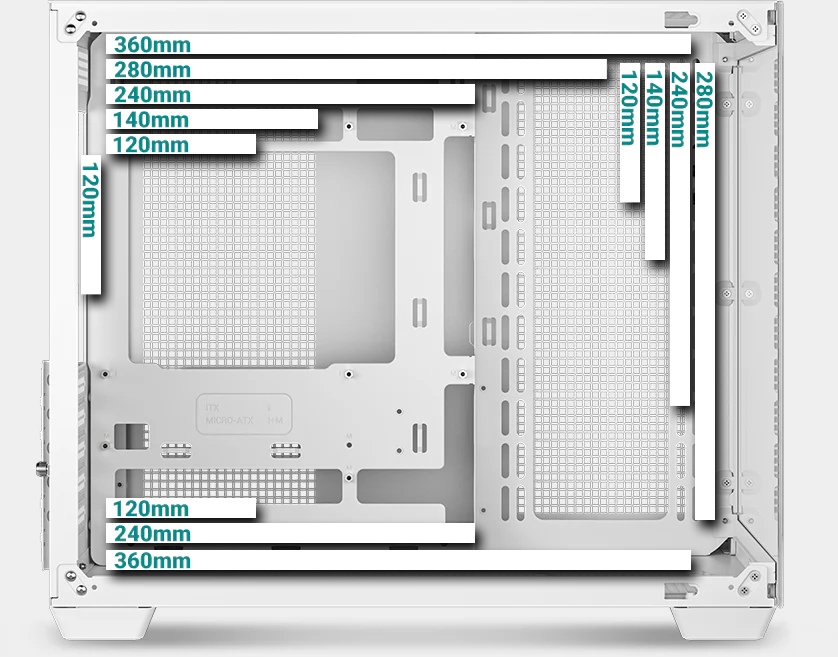 Never fear the heat with CG330 3F WH's exceptional cooling flexibility. Install up to nine 120mm fans throughout the case to maximize airflow, while radiator support includes up to 360mm on the top or bottom, and up to 280mm on the side.