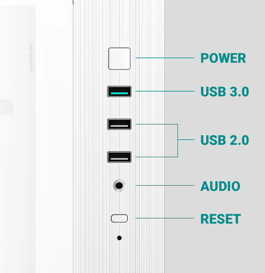 Access ports quickly with a side I/O panel featuring USB 3.0, dual USB 2.0, and an audio jack.