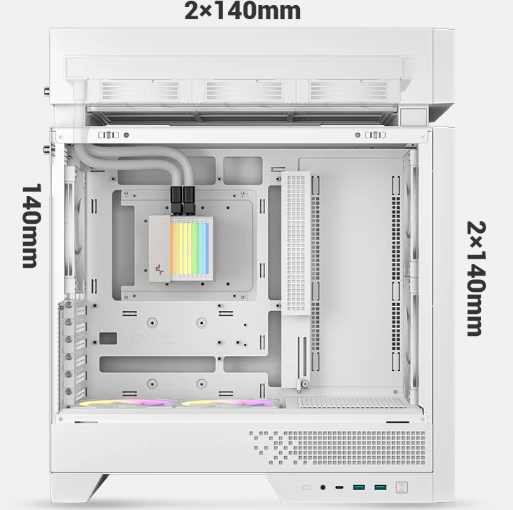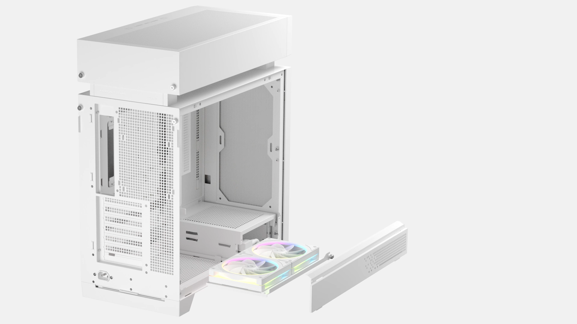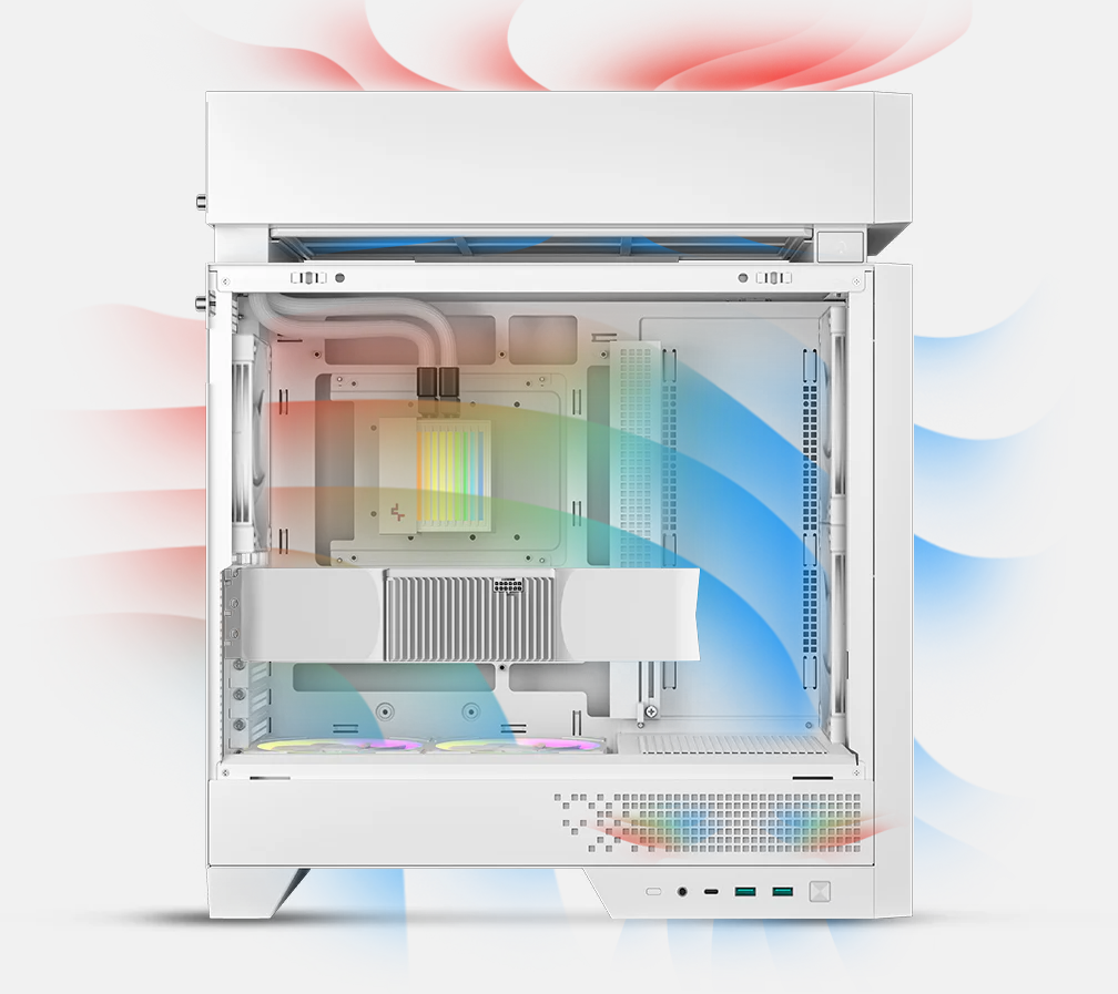 CL6600 WH rethinks case design for the liquid-cooling era. By physically separating thermal zones and airflow paths, it prevents heat buildup and cross-interference that conventional layouts can't avoid. It also comes with an advanced 360mm liquid cooler and dual bottom ARGB fans, delivering strong performance and creating a vibrant interior.