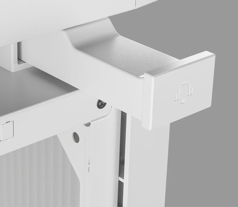 A hidden pop-out hook in the connecting bridge keeps your desk clear.