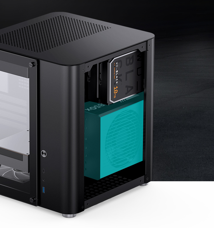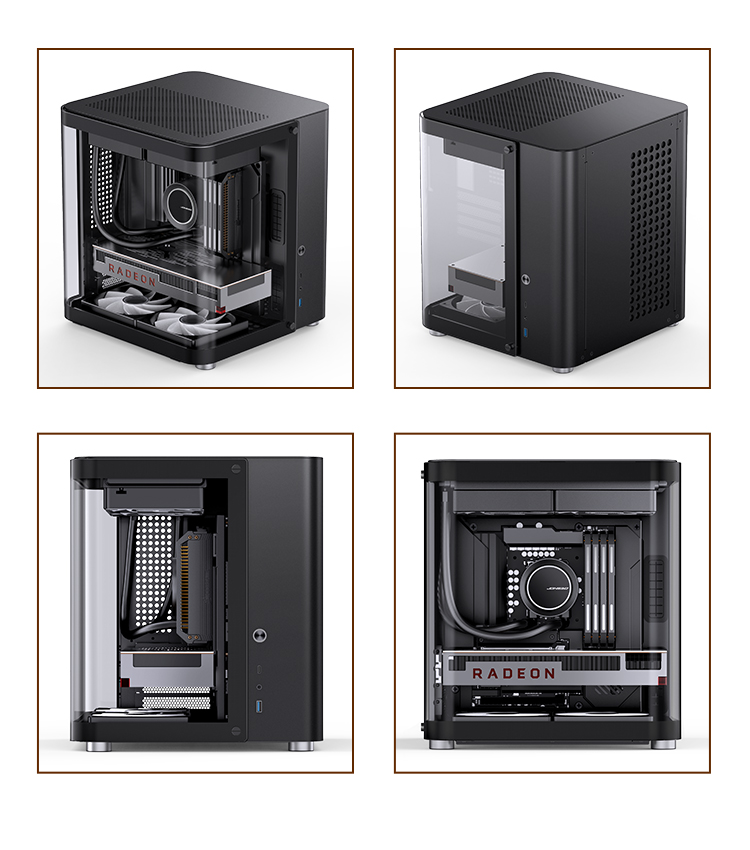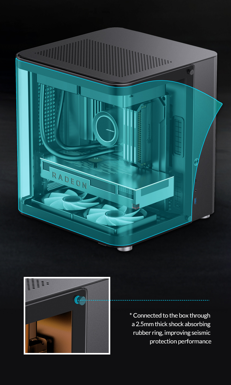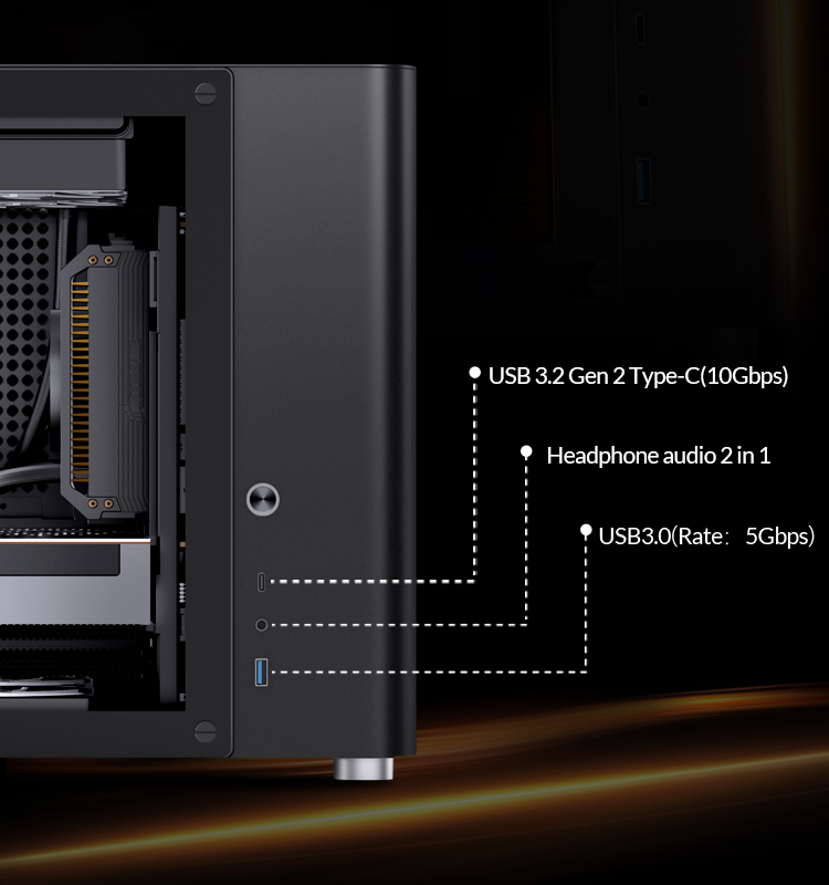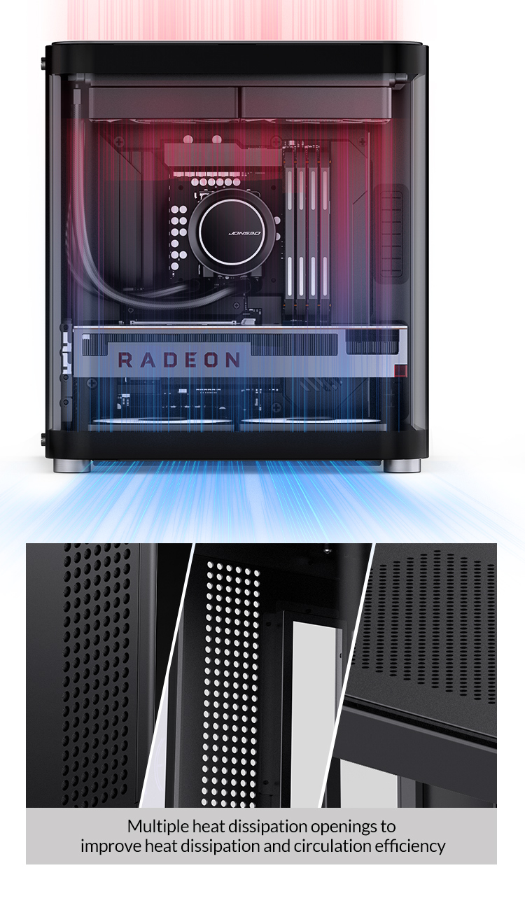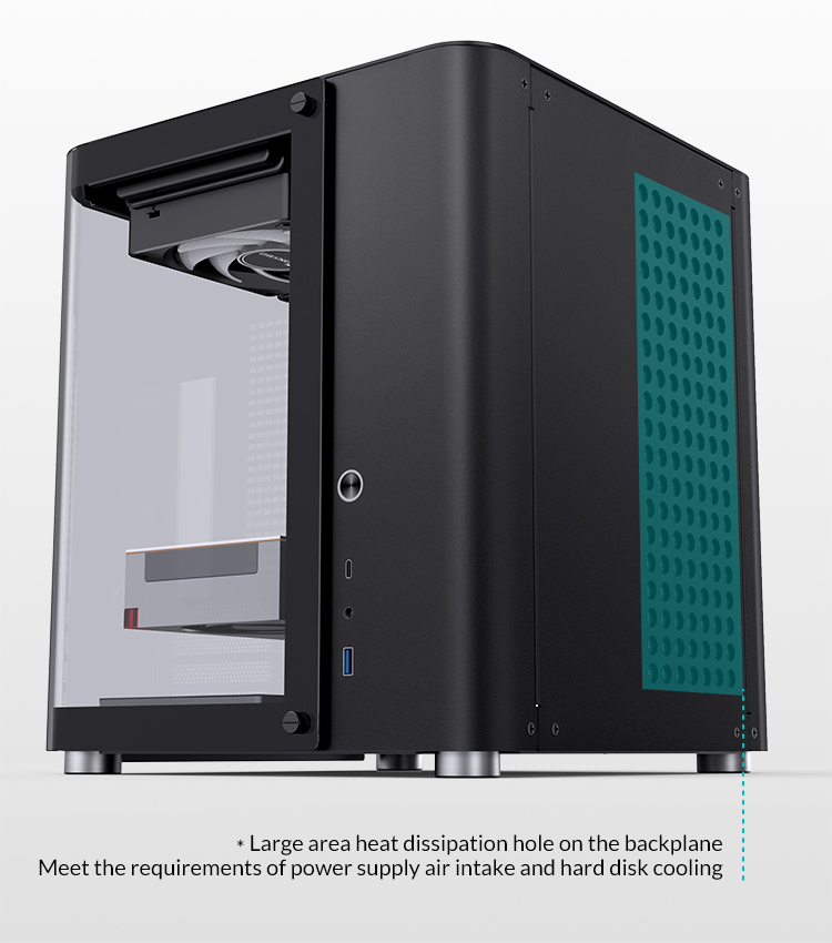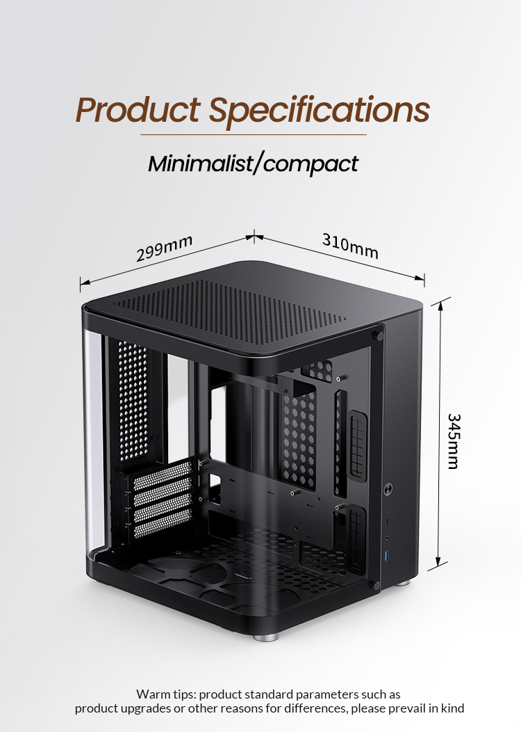 Adopt a 2.5 sided circular view design of curved tempered glass. Full display from multiple perspectives can be obtained both in hardware and garage kit. The multi-angle side view design can support a more reasonable planning of desktop space through multi-angle placement. Good ventilation from the bottom up takes away heat faster. Version 2.0 can support "back-mounted motherboard" (its connectors on the underside of the motherboard), making the wiring inside the case cleaner.