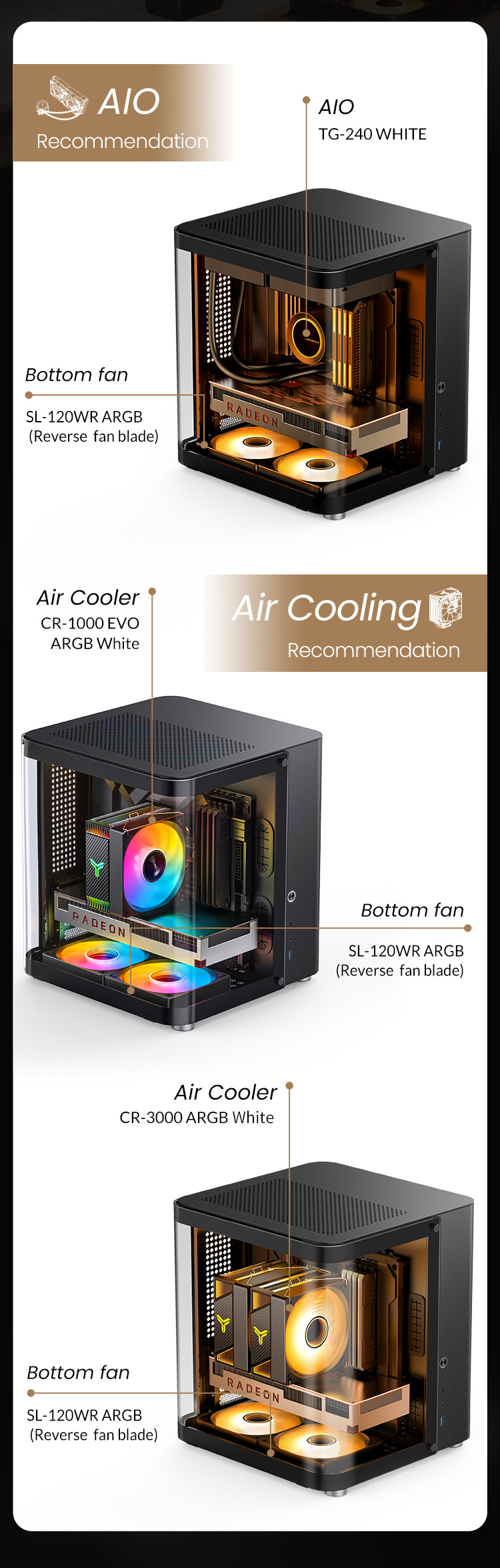 4-position 120mm fan position, bottom-up air flow can quickly cover the heating hardware and exhaust heat from the top vent.
