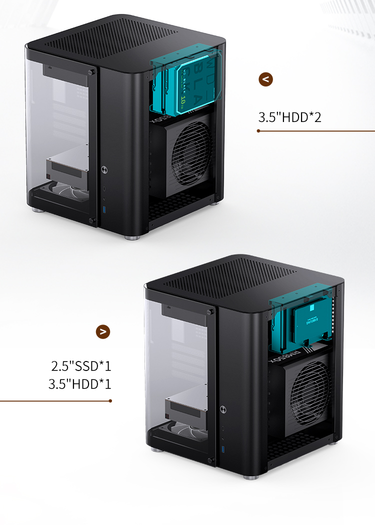 Support 3.5" HDD *2 HDD bay or 2.5" SSD*1/3.5" HDD*1 HDD bay