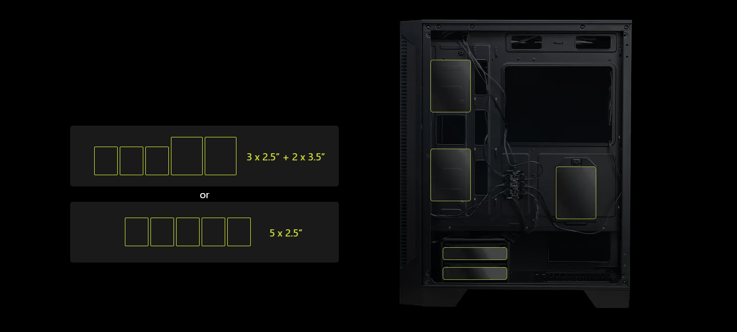 Configure your own storage layout and install up to 5 x 2.5" or 3 x 2.5" + 2 x 3.5" storages.
