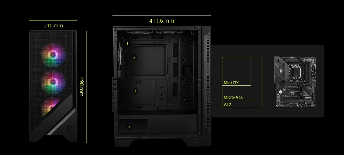 - Supports up to 240 mm AIO liquid cooler and latest 40 series GPUs.