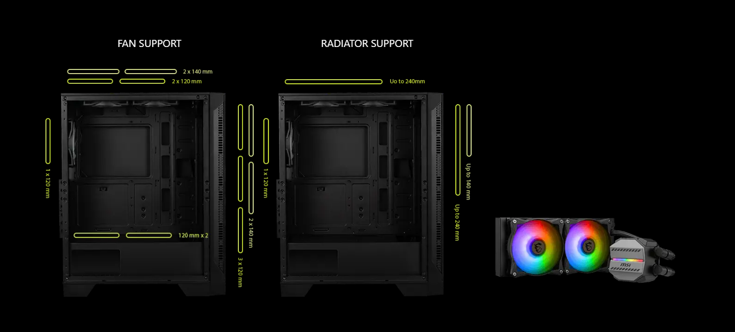 The MAG FORGE 320/120 Series is optimized to provide generous and effective airflow for system cooling. The MAG FORGE 120A AIR FLOW supports up to 6 x 120 mm fans.