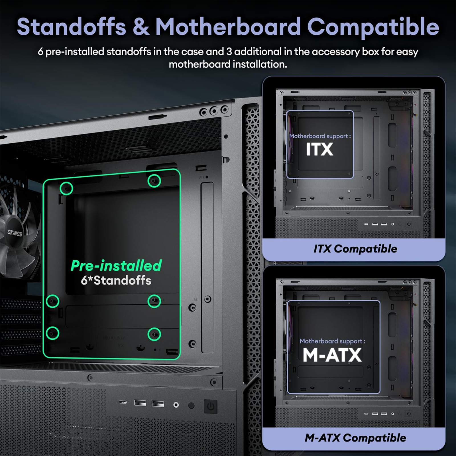 6 pre-installed standoffs in the case and 3 additional in the accessory box for easy motherboard installation.