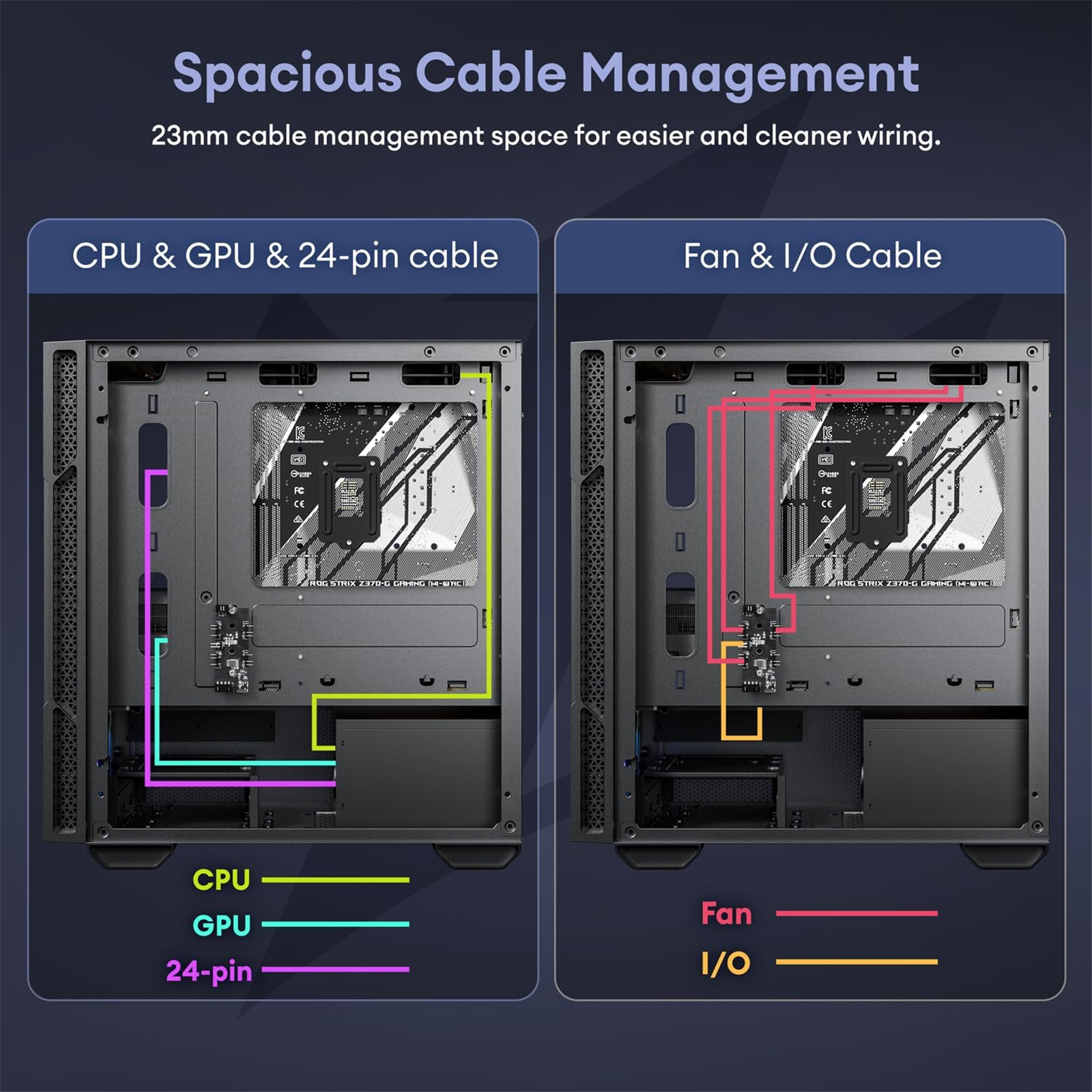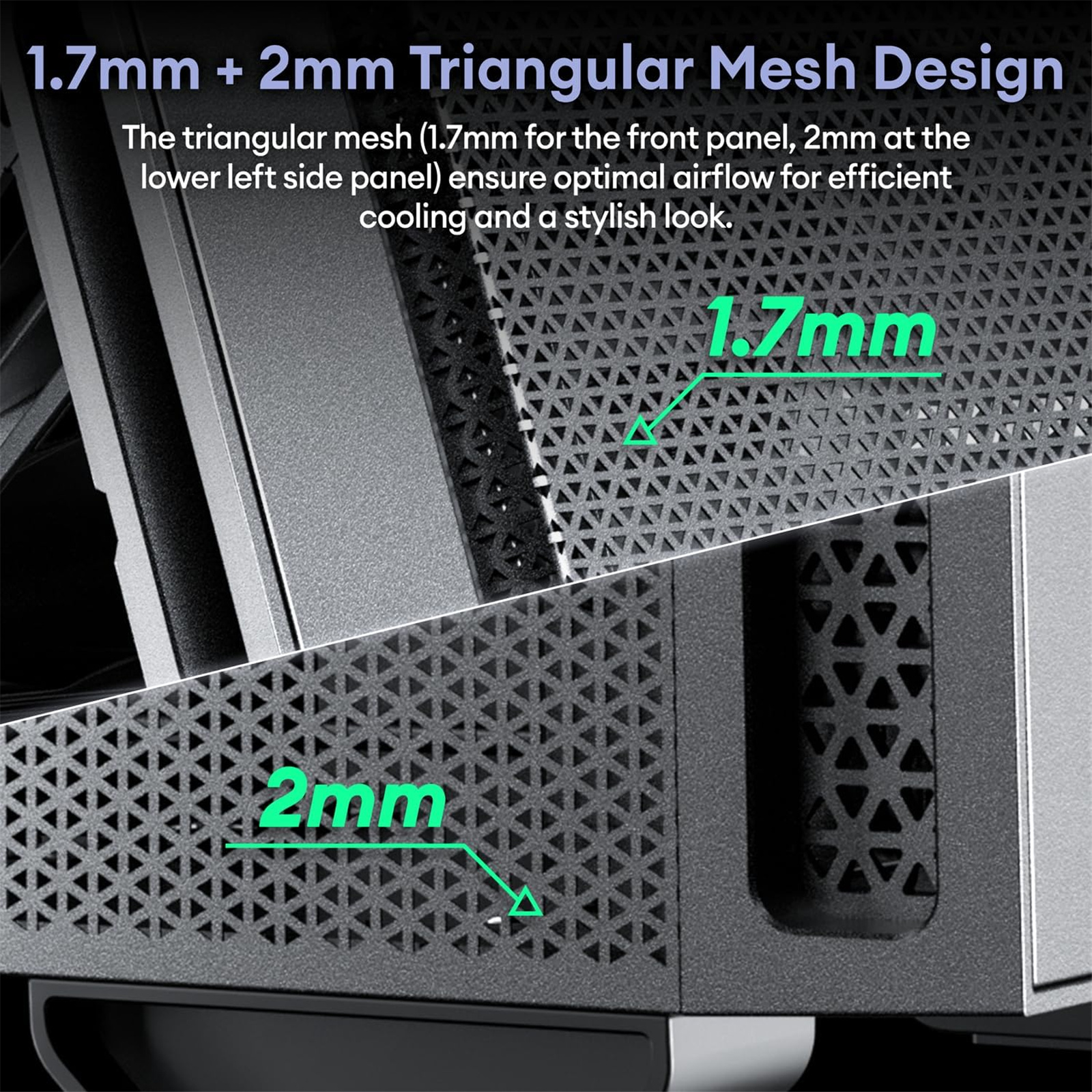 1.7mm mesh on the front panel and 2mm mesh on the lower left side panel, combined with the pre-installed 4 × H12 ARGB fans, maintain optimal airflow inside the chassis, delivering exceptional cooling performance.