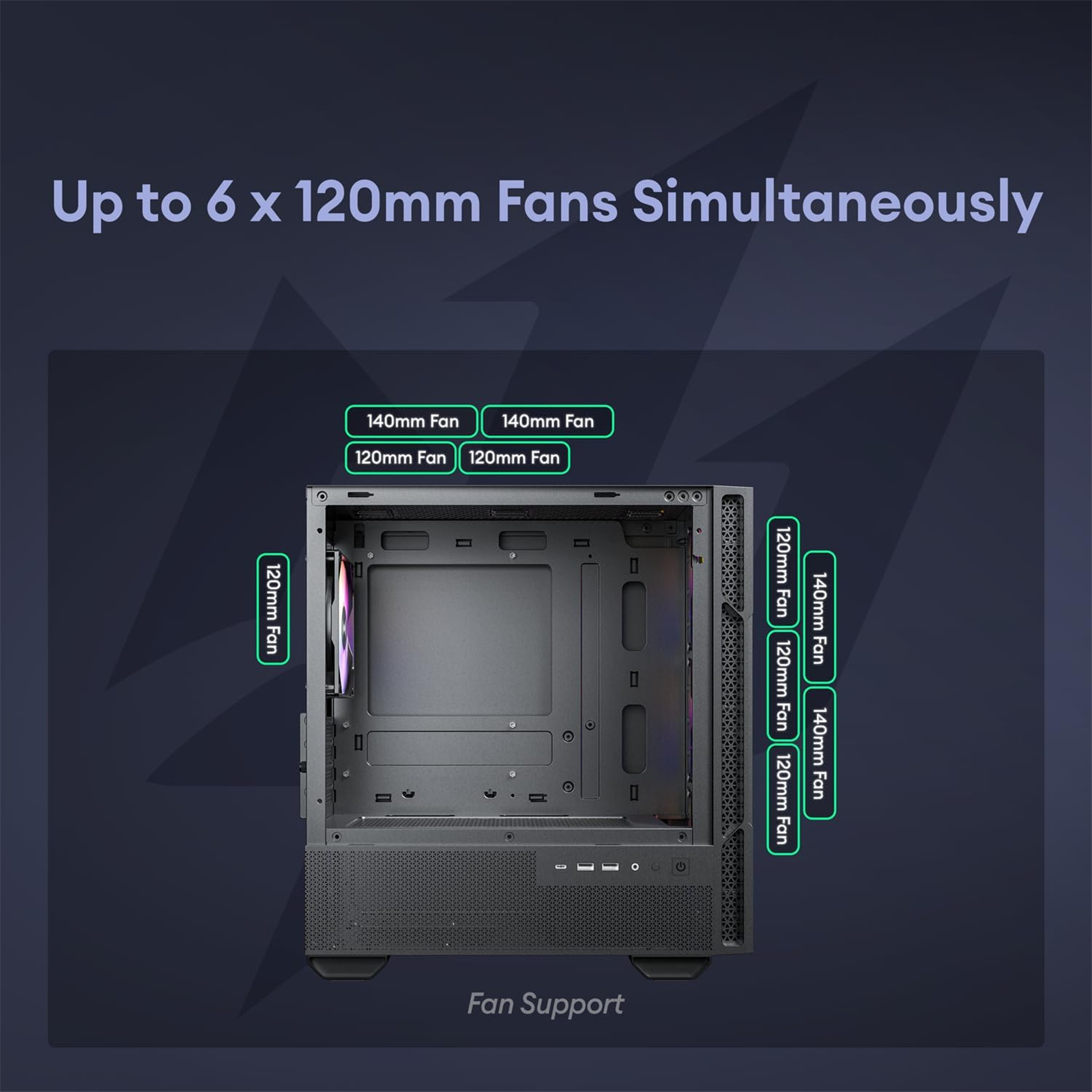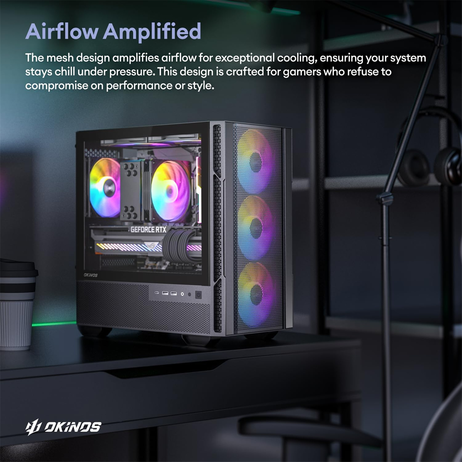 OKINOS Cypress 3 ARGB Black Edition MiniTower mATX Gaming Case Tempered Glass, 4 X ARGB 120mm Fan Pre-Installed, CPU Cooler Support Upto 164mm, GPU Support Upto 320mm, 4x PCI Slot, Front I/O: 2x USB, 1x Type C, HD Audio