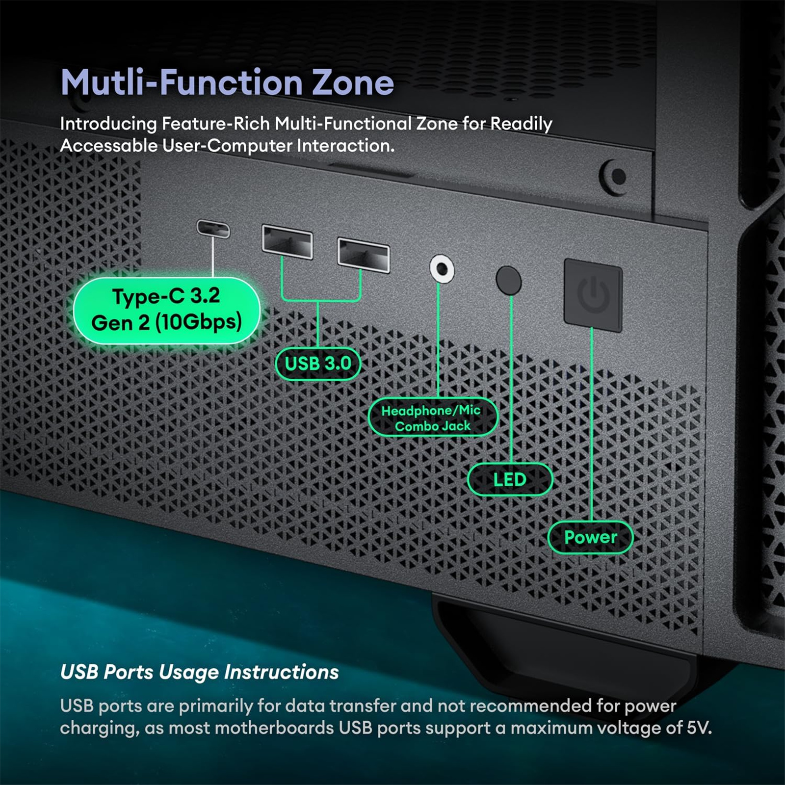 Includes a Type-C 3.2 Gen 2 port, two USB 3.0 ports, audio jacks, and a power switch with start and restart functions. ARGB fan control button is available for customizing lighting.