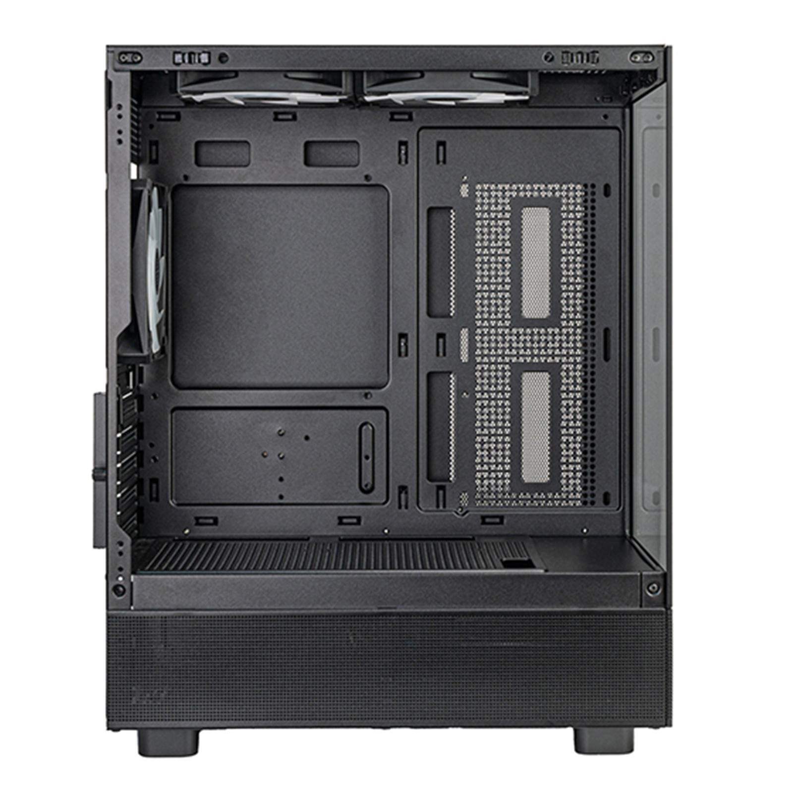The Lucid 04 is equipped with multiple fan mounting points, providing versatile cooling options for both CPU and GPU. The top compartment also supports a 280mm liquid cooling radiator for efficient heat dissipation.