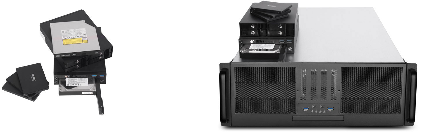 Offers users a wide range of hard drive options including support for 5.25"/3.5"/2.5" hard drives and slim optical drives