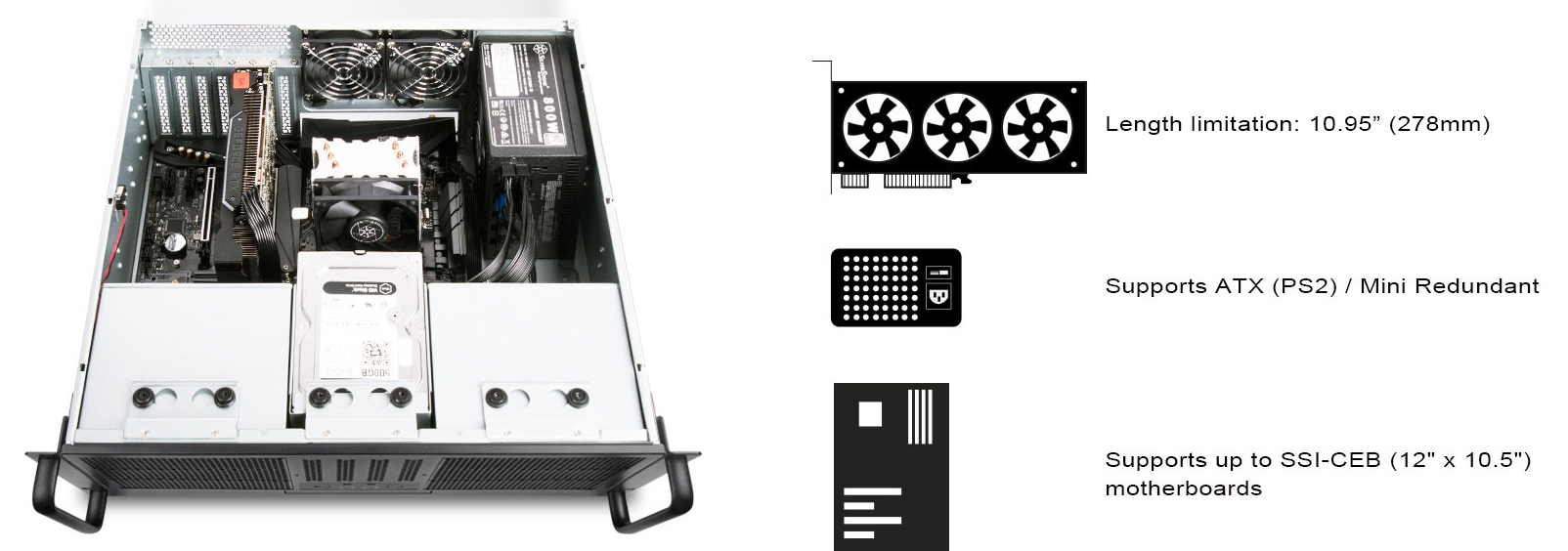 - Supports up to SSI-CEB motherboard