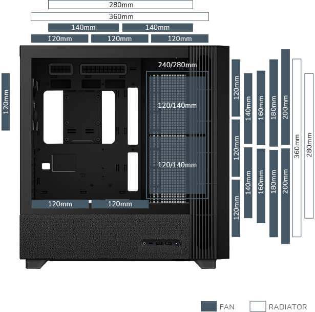 Top and front panels allow for the installation of 360 mm or 280 mm radiators