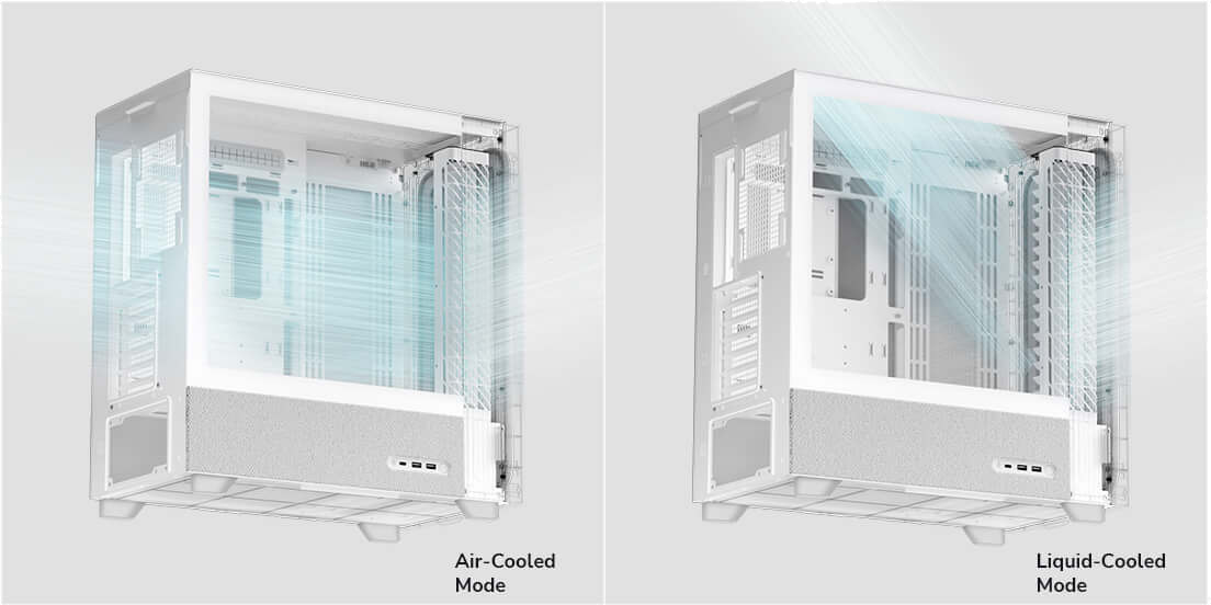 - Support for 360 mm liquid cooling and high-wattage power supplies