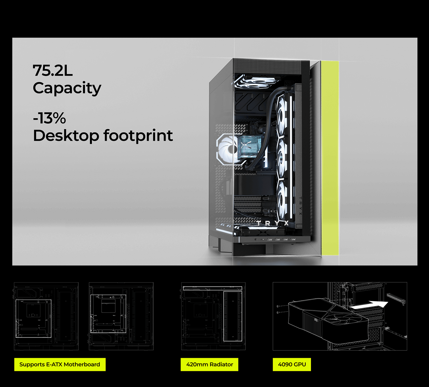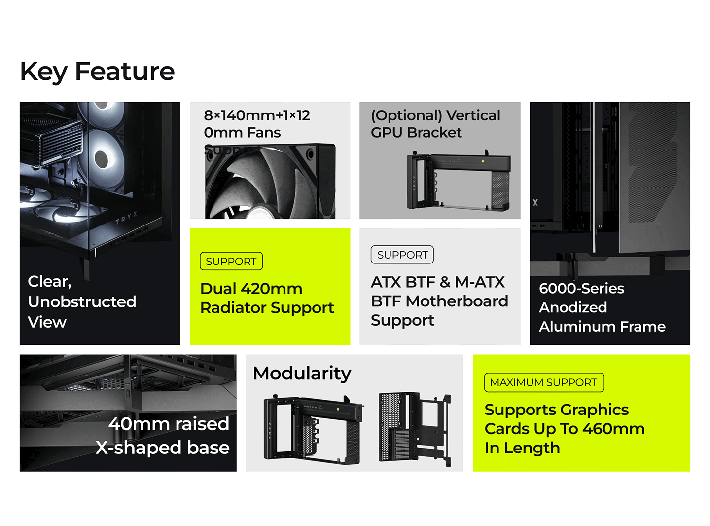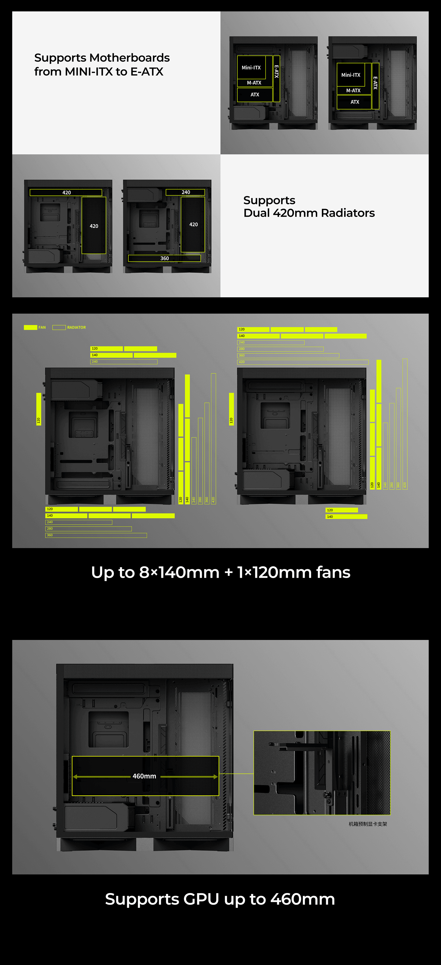 CPU Cooler Support up to 170mm - GPU Support up to 460mm - 420mm Radiator Support - 7x PCI Slots - Front I/O: 4x USB - 1x USB-C - HD Audio