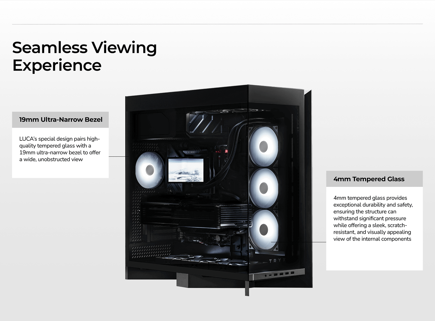 TRYX LUCA L70 Tempered Glass ATX Mid Tower Case - Black CPU Cooler Support up to 170mm - GPU Support up to 460mm - 420mm Radiator Support - 7x PCI Slots - Front I/O: 4x USB - 1x USB-C - HD Audio