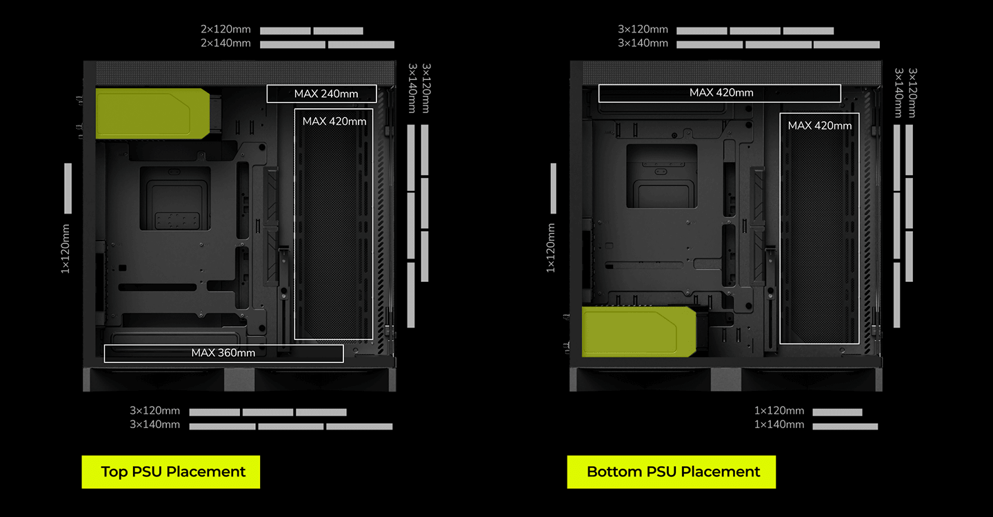 Bottom: 240 / 280 / 360 mm (top PSU placement: 120 mm)