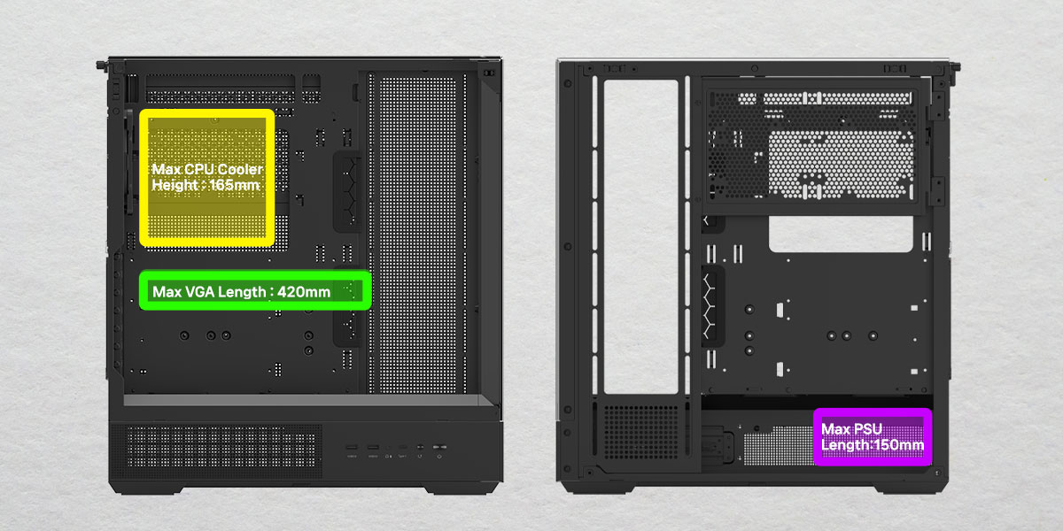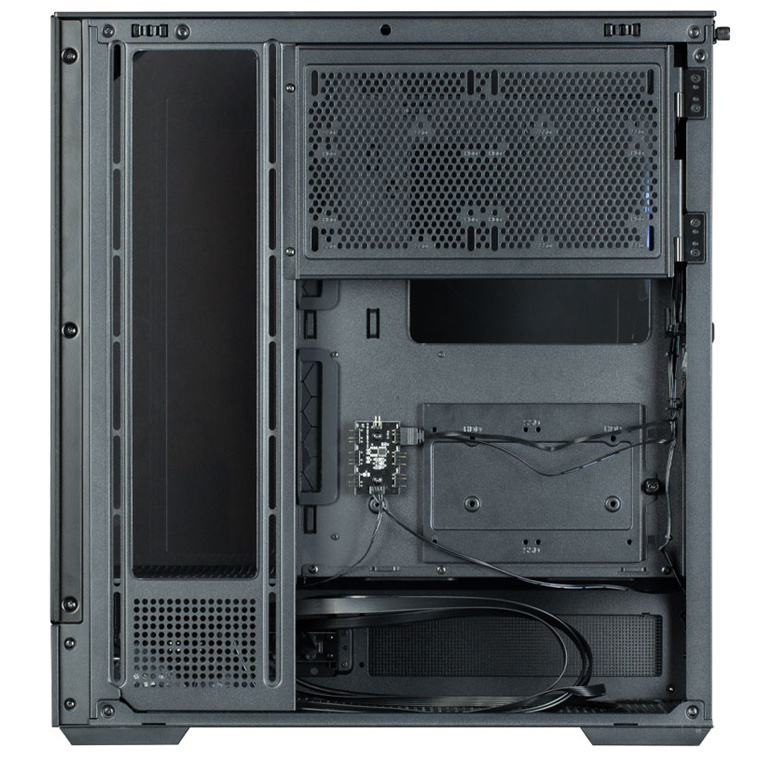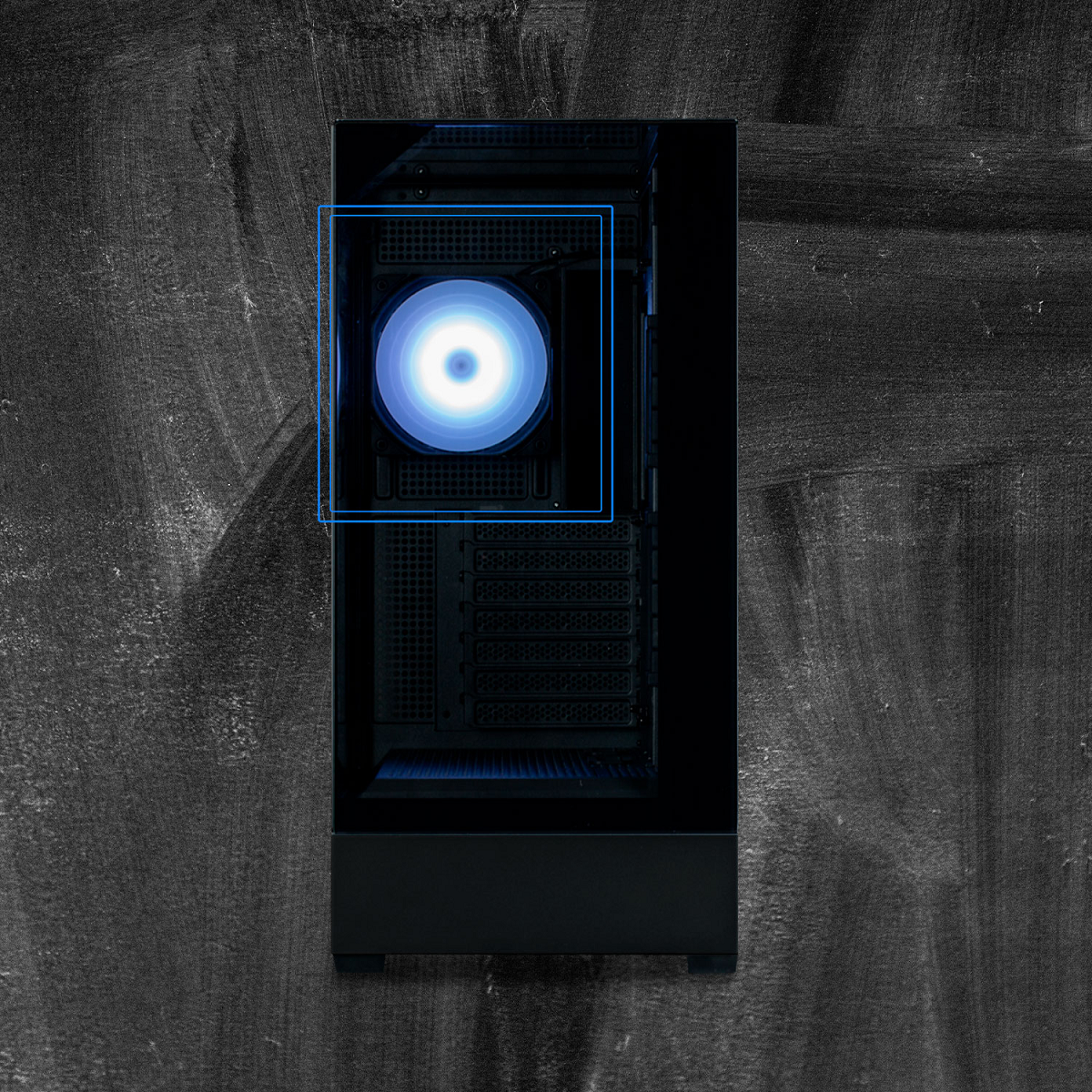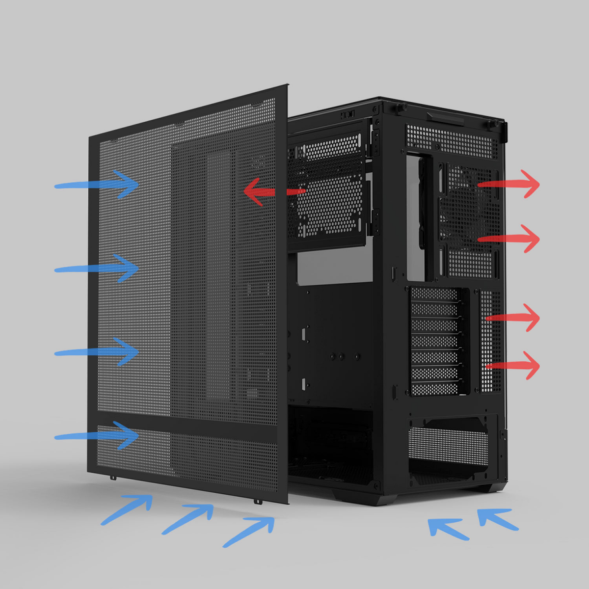 Full-Mesh Side Panel exhaust vent above the motherboard for optimized airflow.