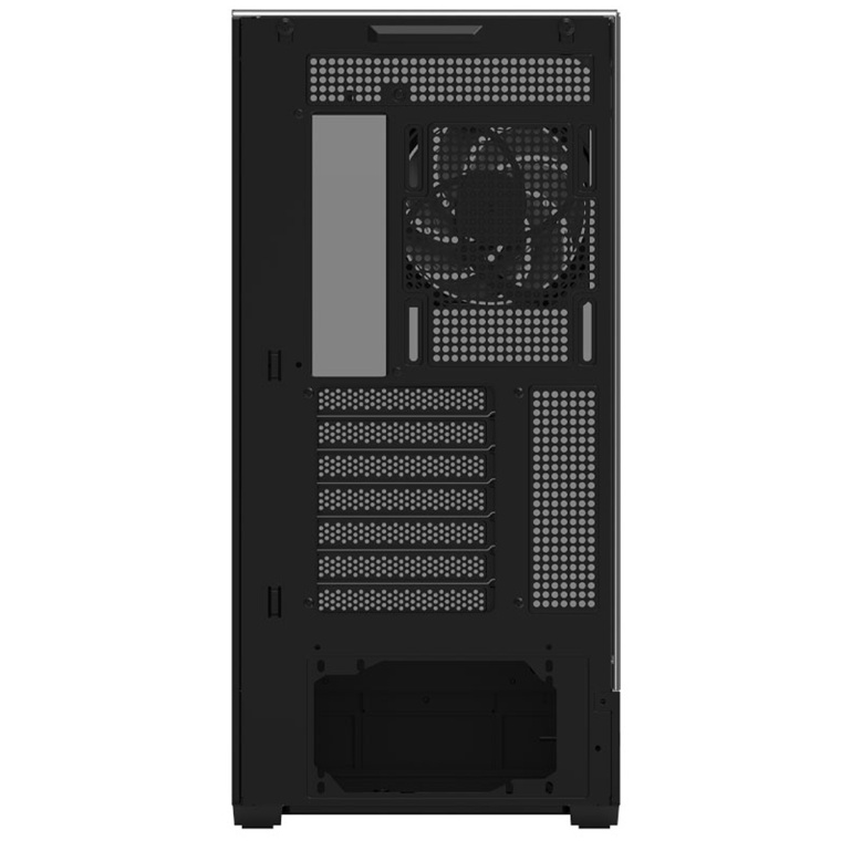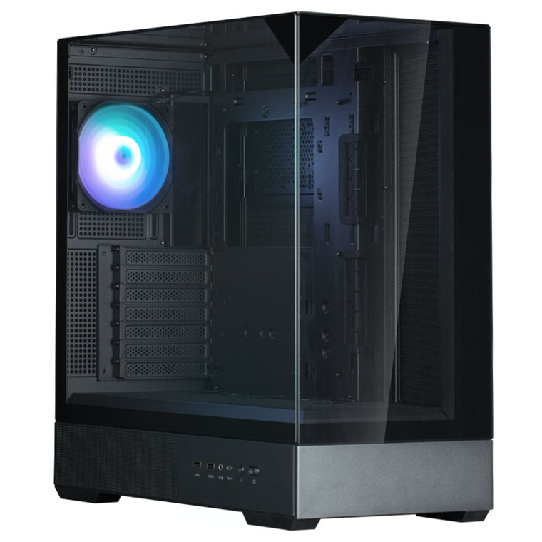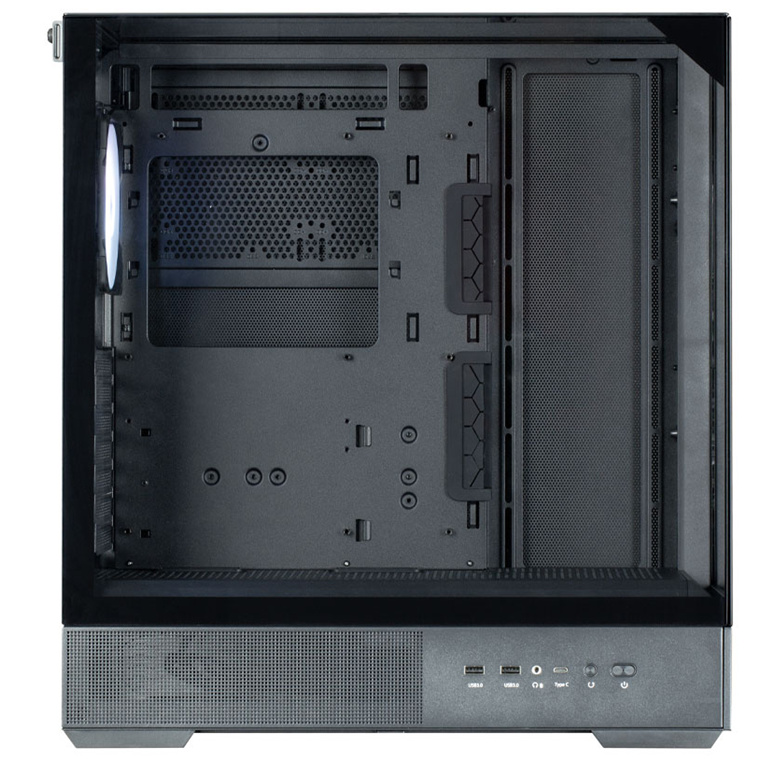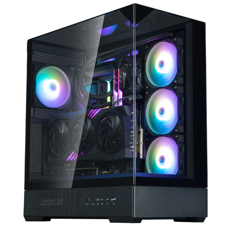 A new paradigm in design eliminates the chassis frame, providing an open feeling and unobstructed view. Tempered glass panels across the front, sides, and top create a seamless look.