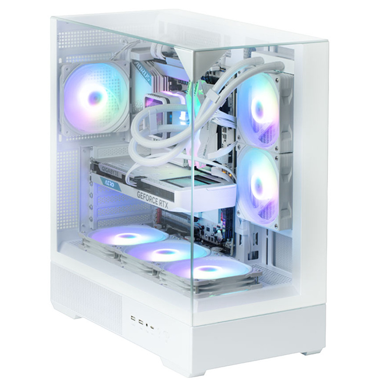A new paradigm in design eliminates the chassis frame, providing an open feeling and unobstructed view. Tempered glass panels across the front, sides, and top create a seamless look.