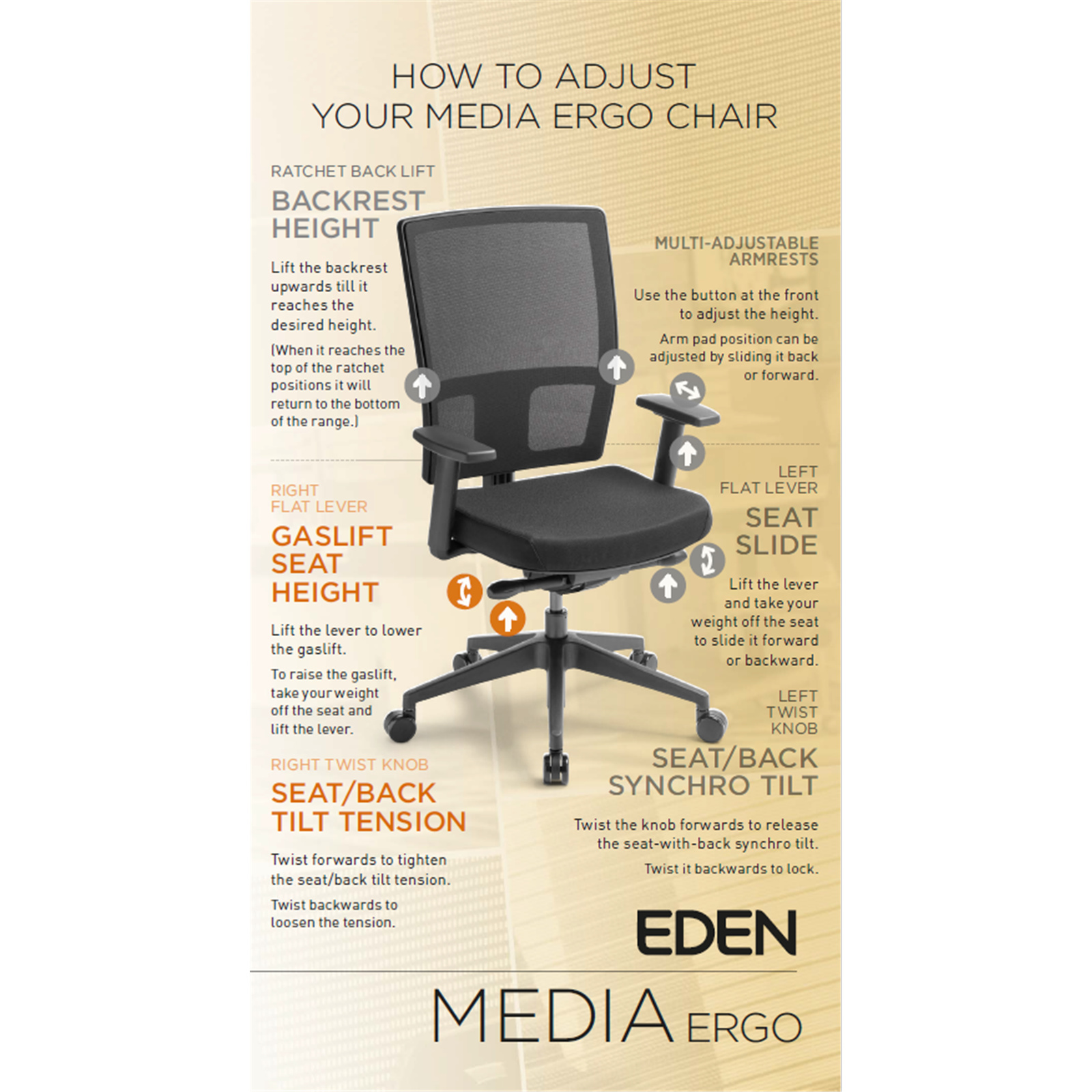 Eden Office Media Ergo Task Office Chair, 7-Way Ergonomic Adjustment - With Armrest - Standard Black Fabric - Max Weight 140kg - 10 Years Local Warranty