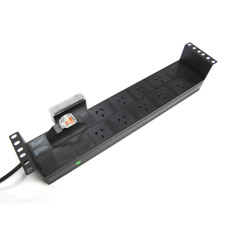 DYNAMIX 10 Outlet 2RU Horizontal Power Rail (10A) with 6kVa C Curve MCB Circuit Breaker, on/off switch & 50mm Recessed Brackets. 2M Power Cord with 10A 3 Pin Plug BLACK Colour
