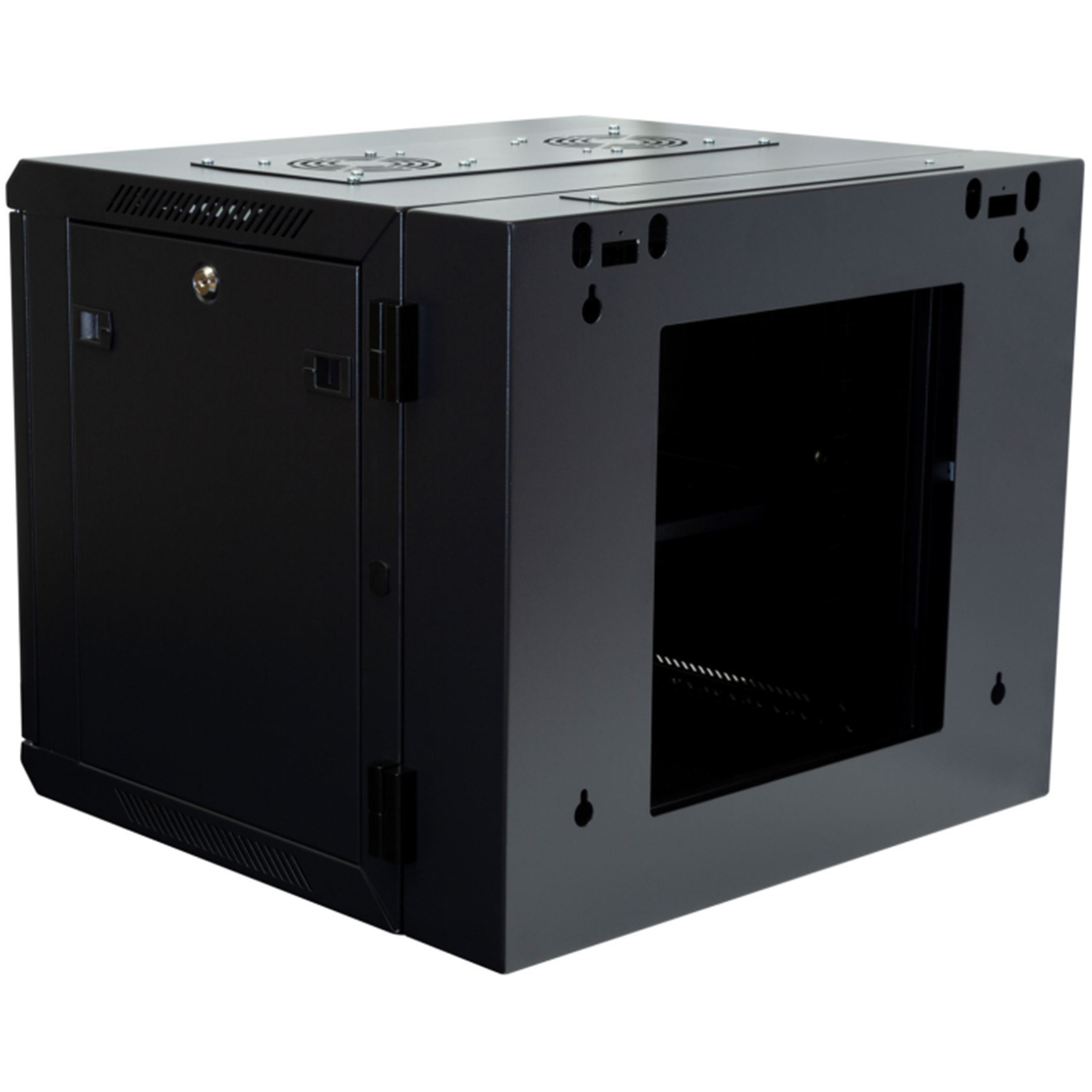 DYNAMIX 9RU Universal Swing Wall Mount Cabinet. Removable Back mount supplied with Left & Right Hinges (600 x 550 x 501mm). Includes 2x fans, 1 x fixed shelf, 10 x cage Gloss black colour.