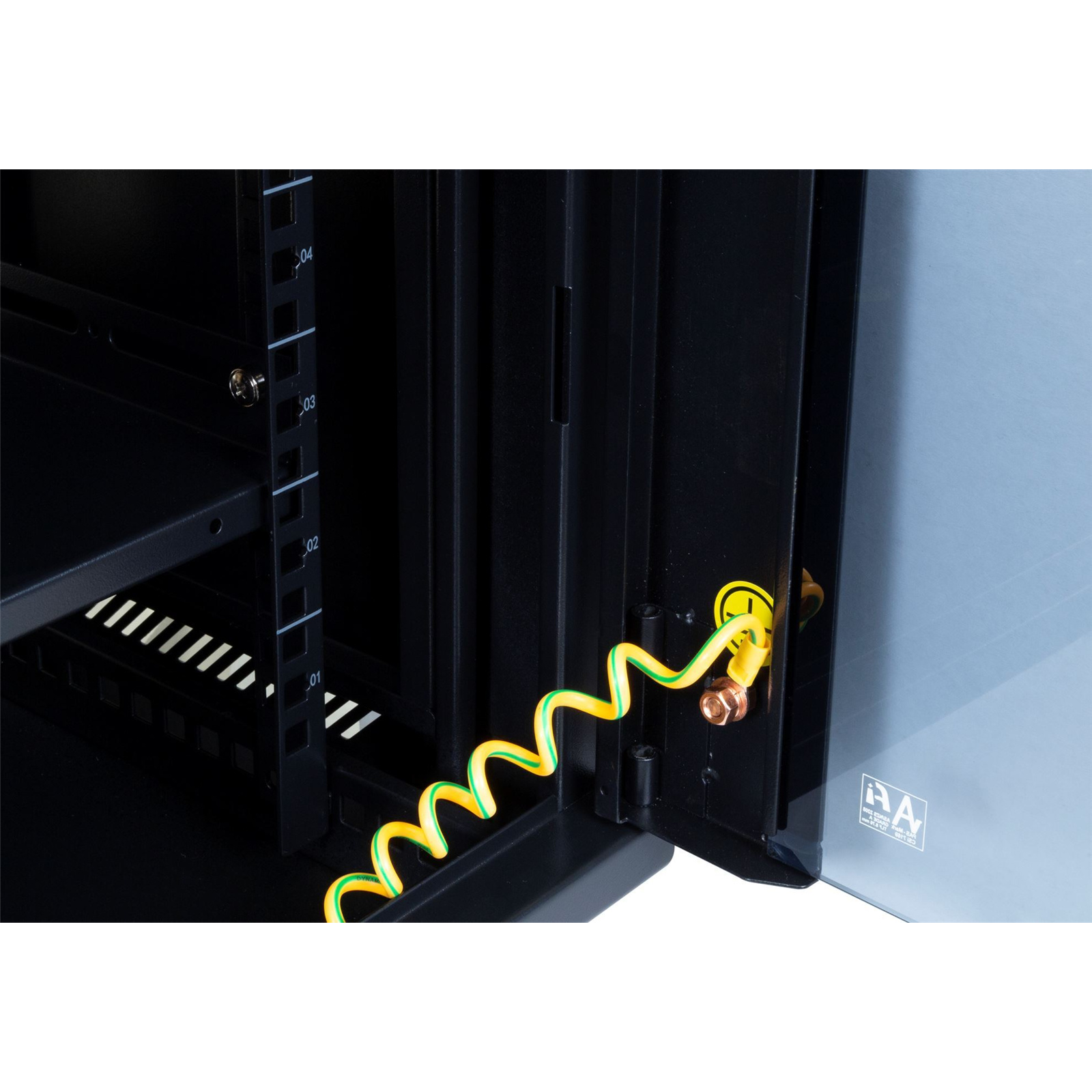 Dynamix RSFDS9 9RU Universal Swing Wall Mount Cabinet - Removable Backmount supplied with Left & Right Hinges (600x550x501mm) - Includes 1x Fixed Shelf, 2x Fans,10x Cage Nuts, Black Gloss colour, Side Entry
